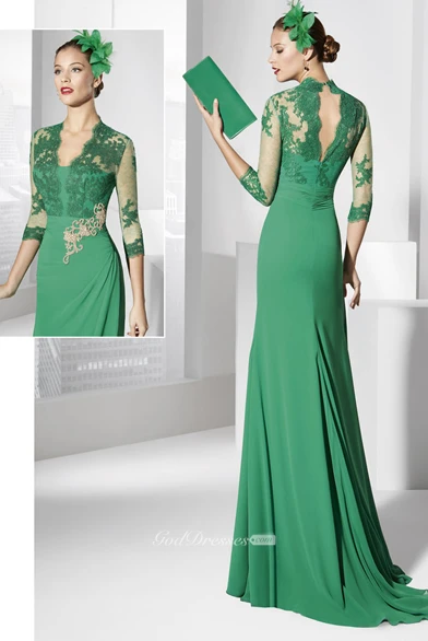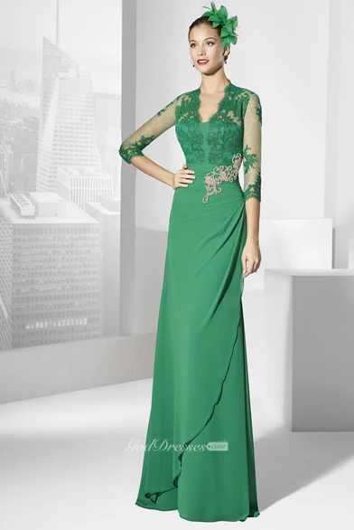 Sheath V-Neck Floor-Length Appliqued Half-Sleeve Jersey Prom Dress