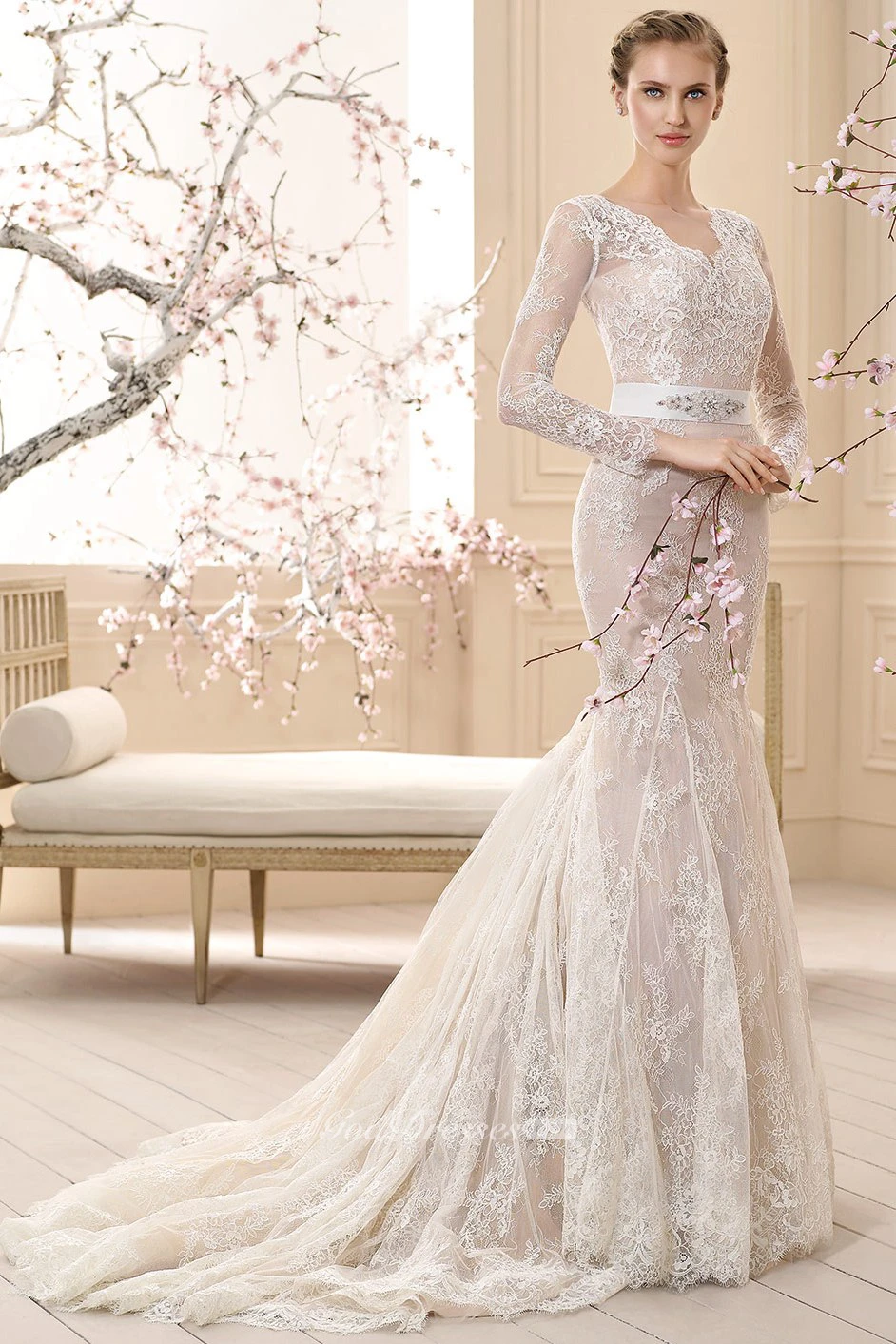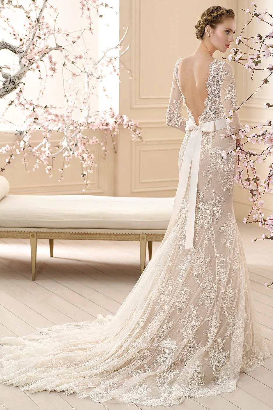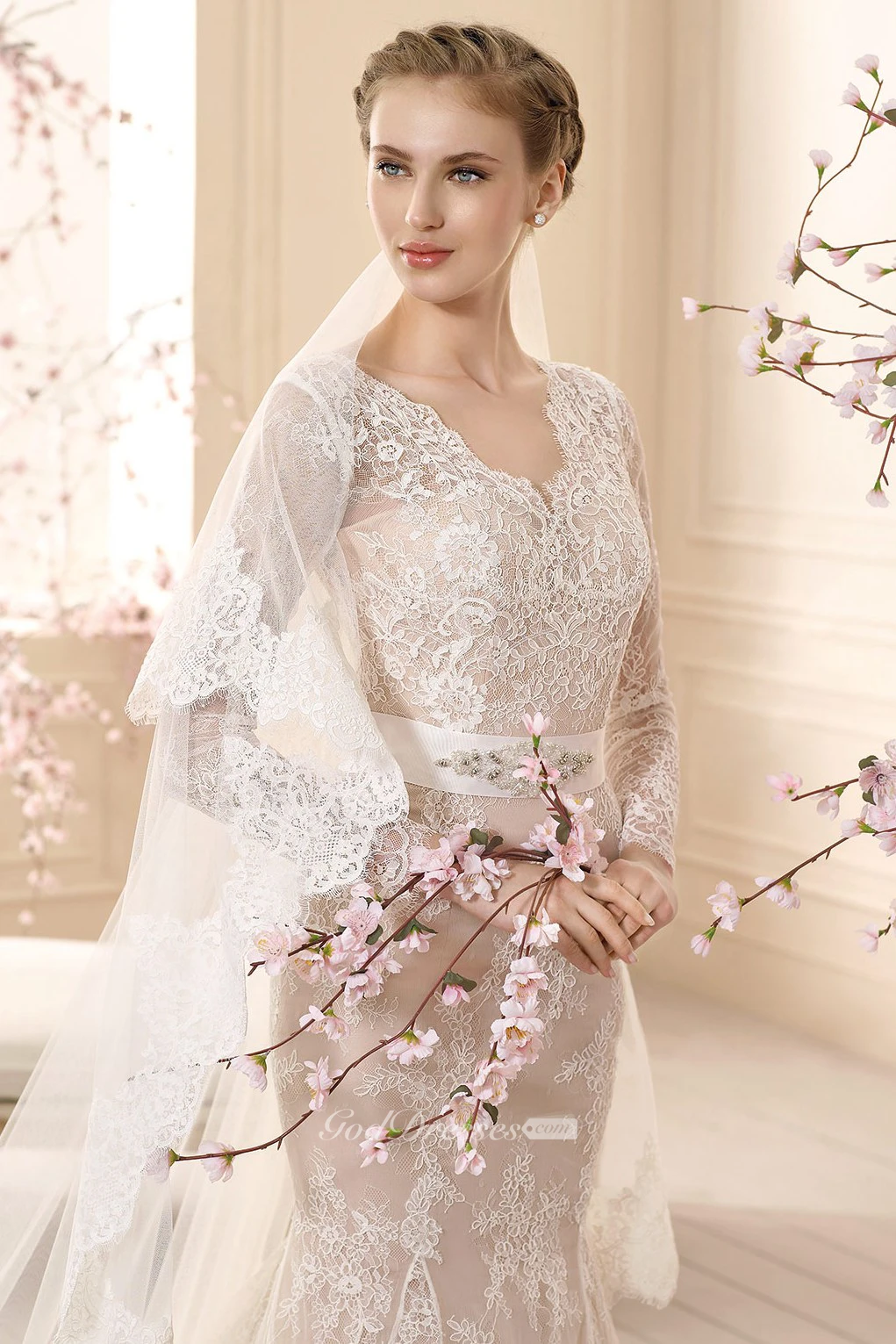 Sheath V-Neck Floor-Length Long-Sleeve Appliqued Lace Wedding Dress With Waist Jewellery And Bow