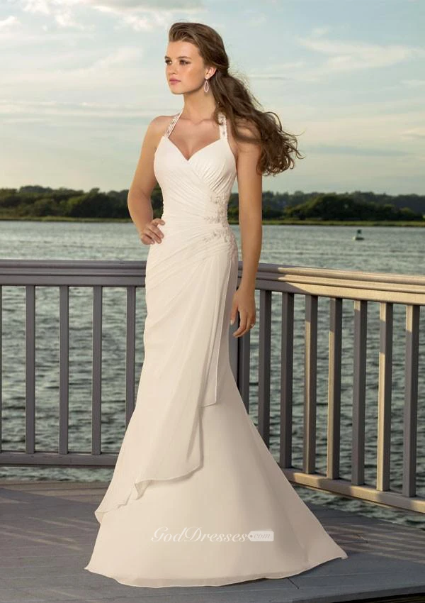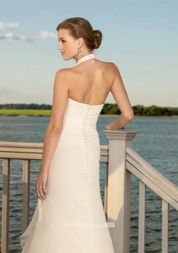 Halter neckline looks so pretty. I like the design a lot. Draping and ruching impart a unique style to the simple gown in chiffon. I like the way it shows your back. If you are in search of a stylish yet sophisticated wedding gown, this one is a good choice.