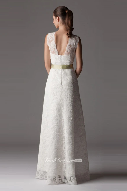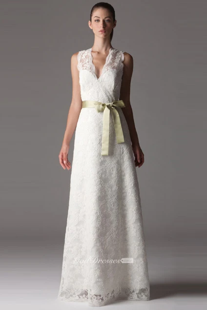Sheath V-Neck Long-Sleeveless Lace Wedding Dress With Bow And V Back