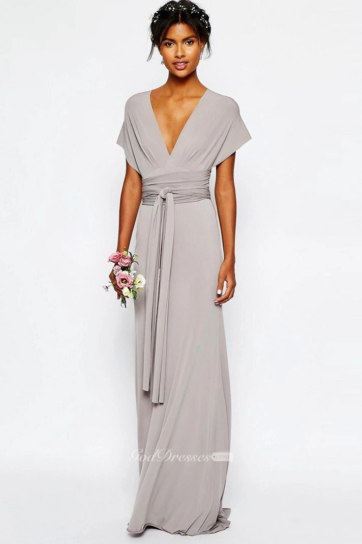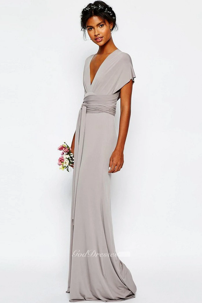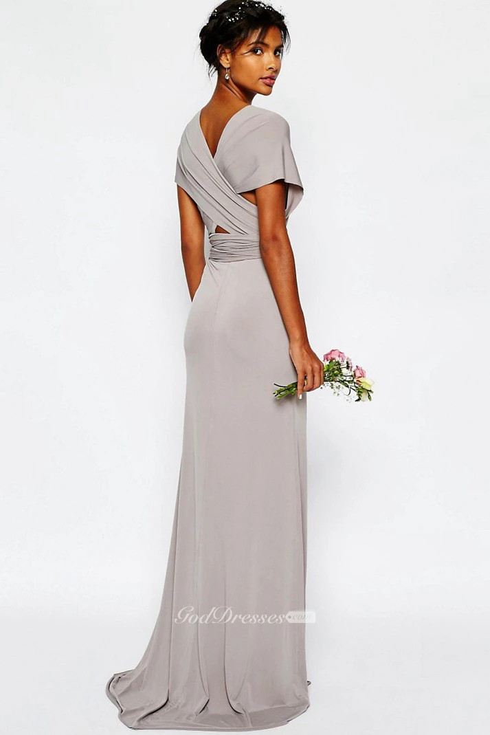 Sheath V-Neck Sash Floor-Length Short-Sleeve Jersey Bridesmaid Dress