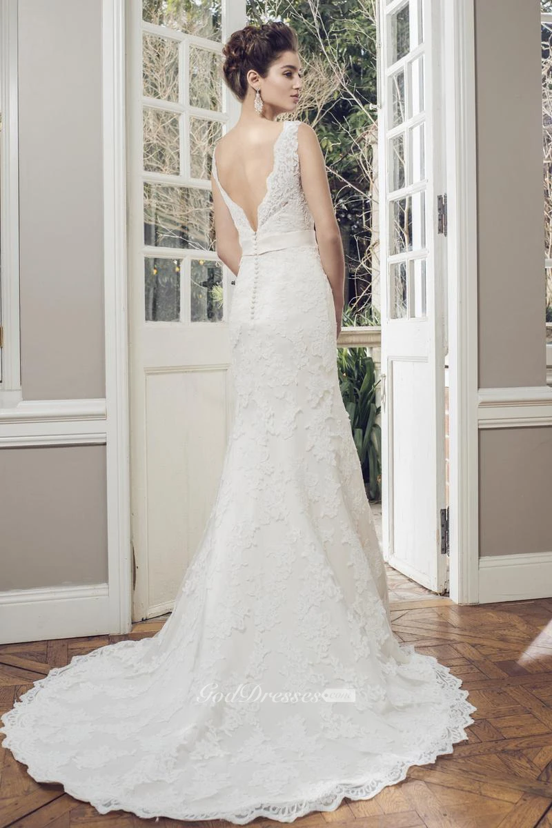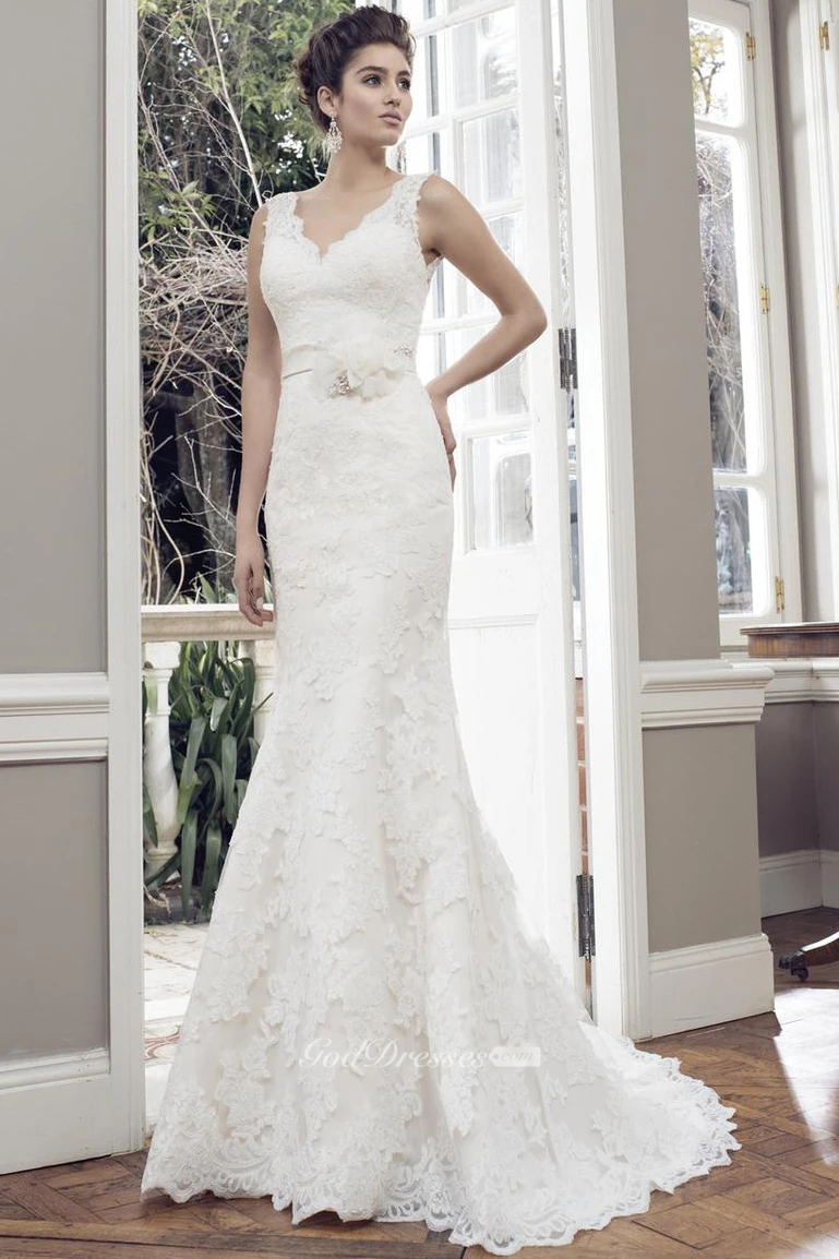 Sheath V-Neck Sleeveless Appliqued Floor-Length Lace Wedding Dress With Flower And Low-V Back