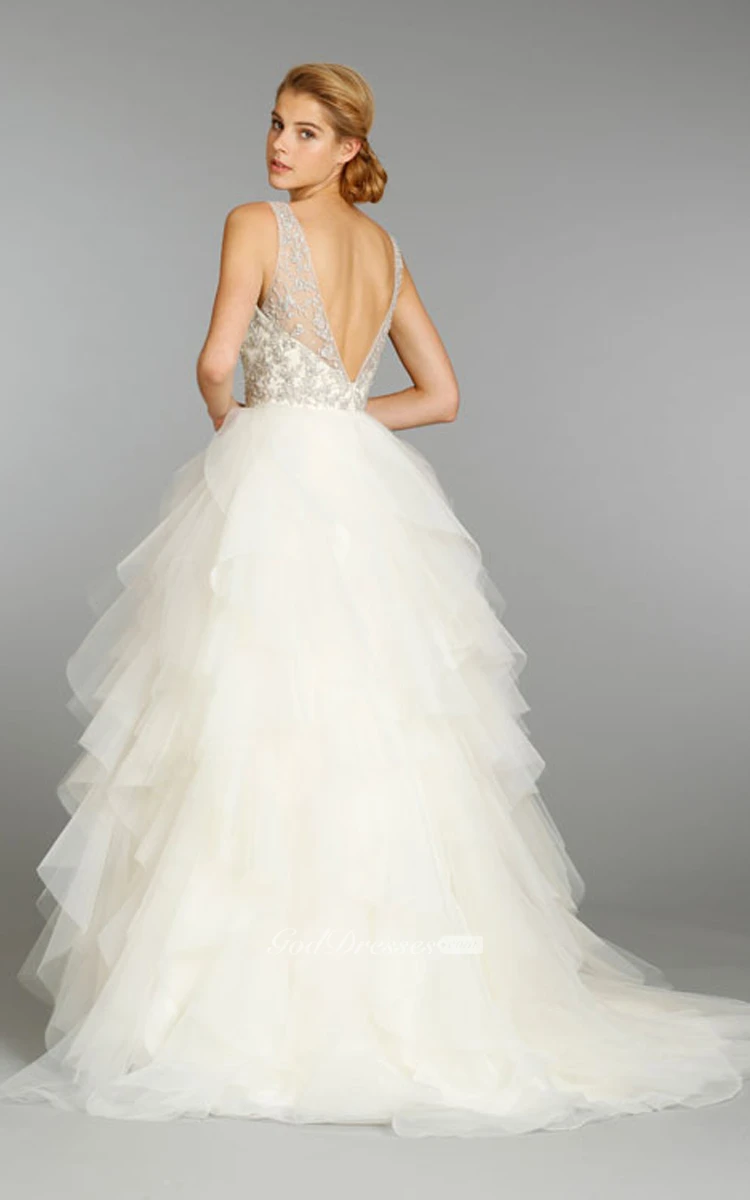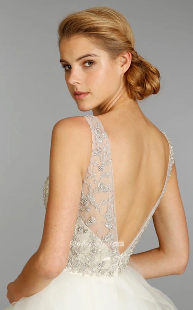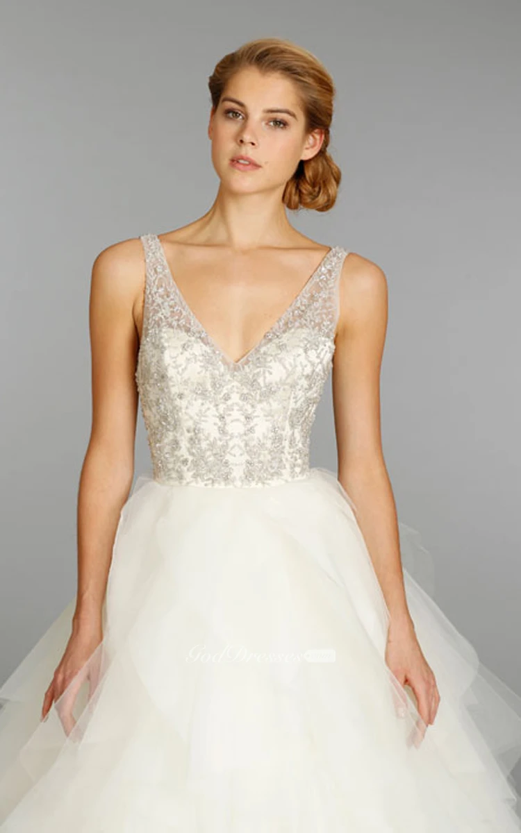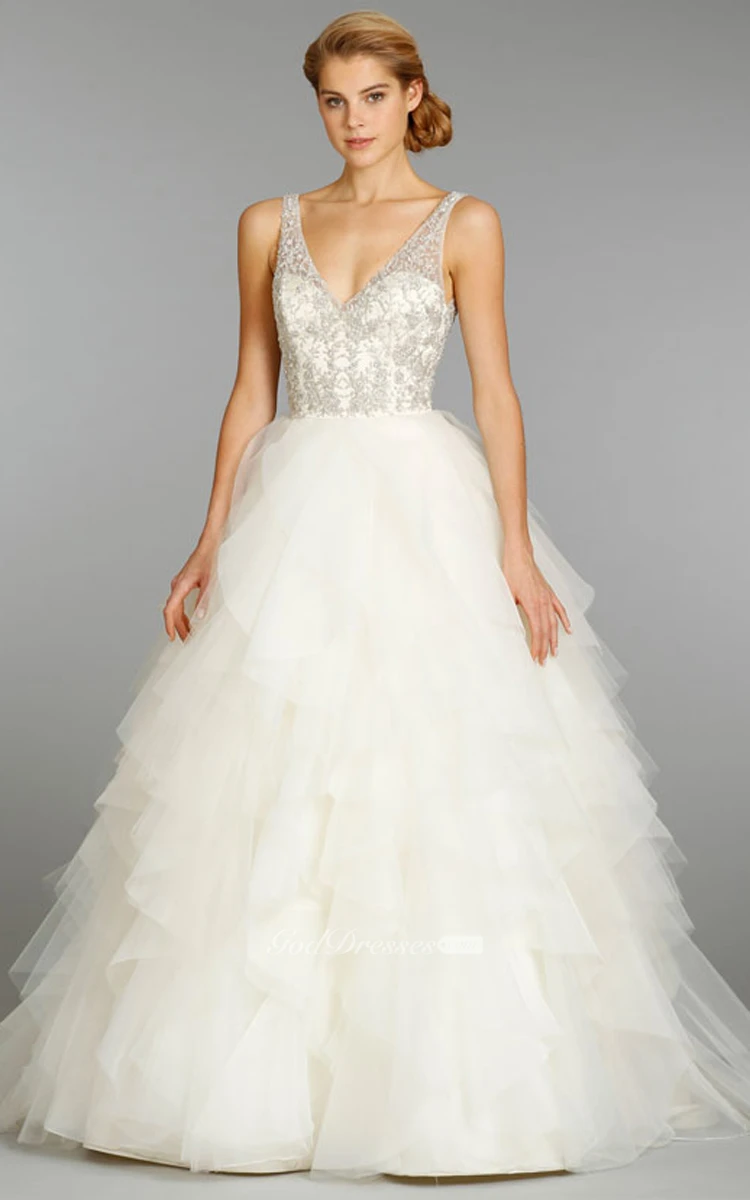 Shimmering V-Neck Organza Ruffle Dress With Beaded Embroidery
