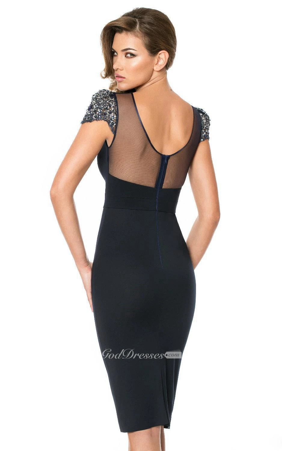 Shining Sequins Sheath Bateau Short Sleeve Backless Knee Length Rhinestone Formal Gowns