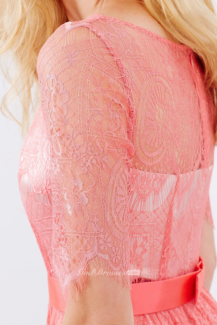 Short Half Sleeve Ribboned Scoop Neck Lace Bridesmaid Dress