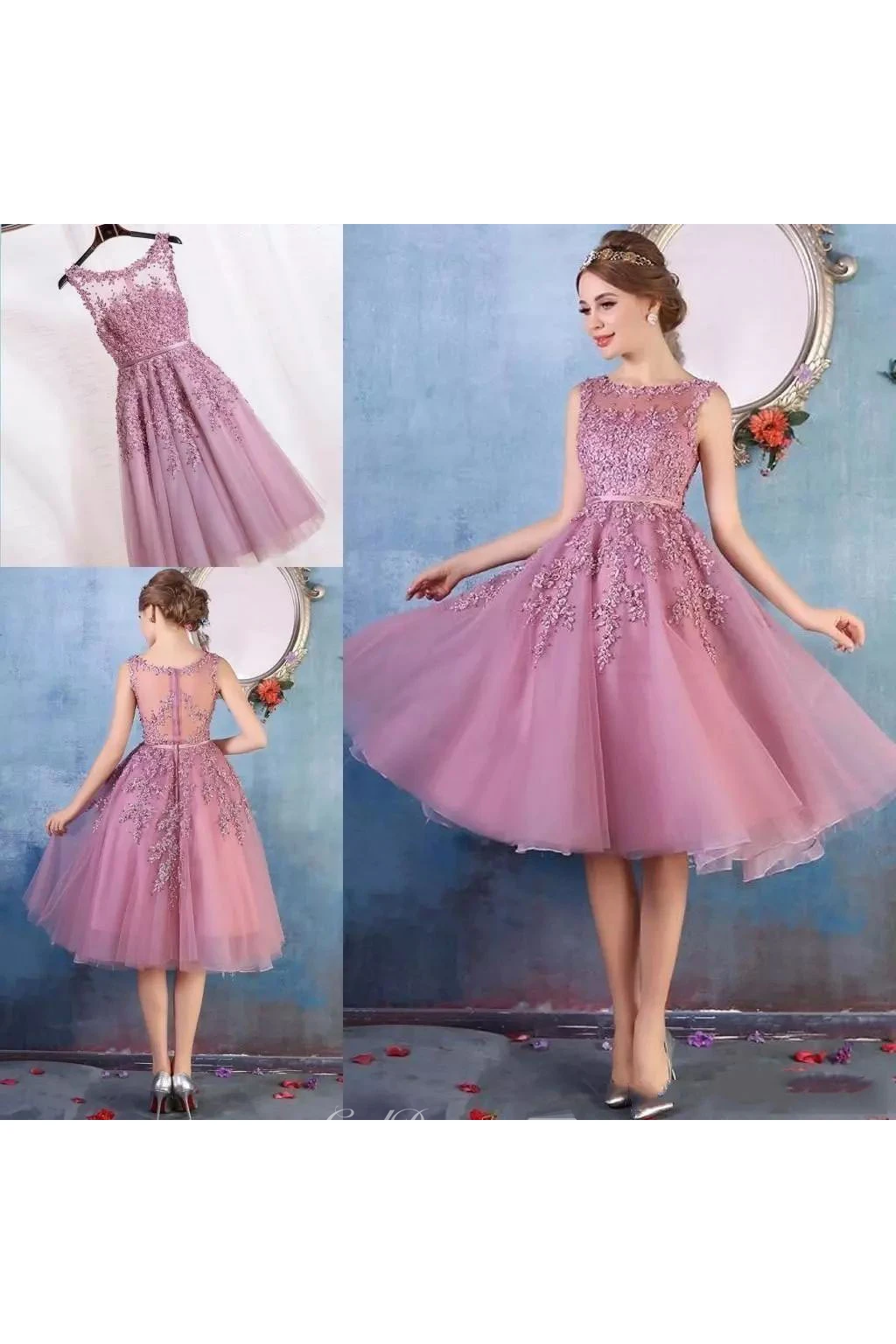 Short Mini Sleeveless Tulle Adorable A-Line Scoop Petite Zipper Back Appliques Bridesmaid Dress