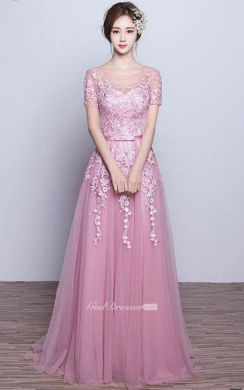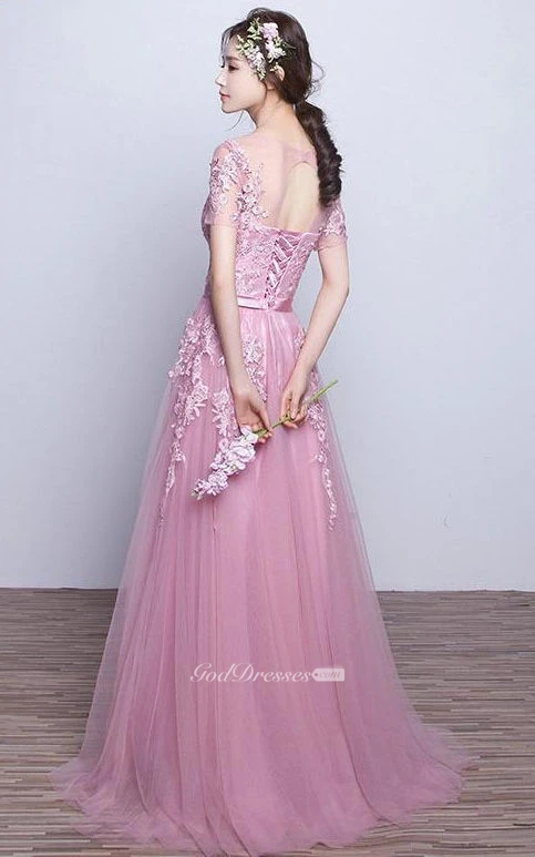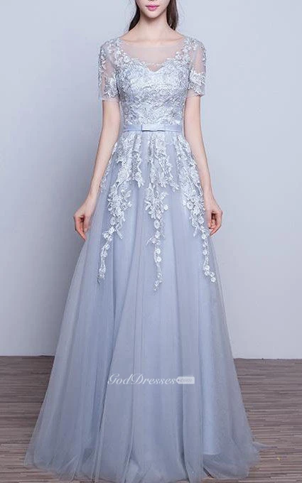 Short Sleeve A-line Long Tulle Dress with Appliques