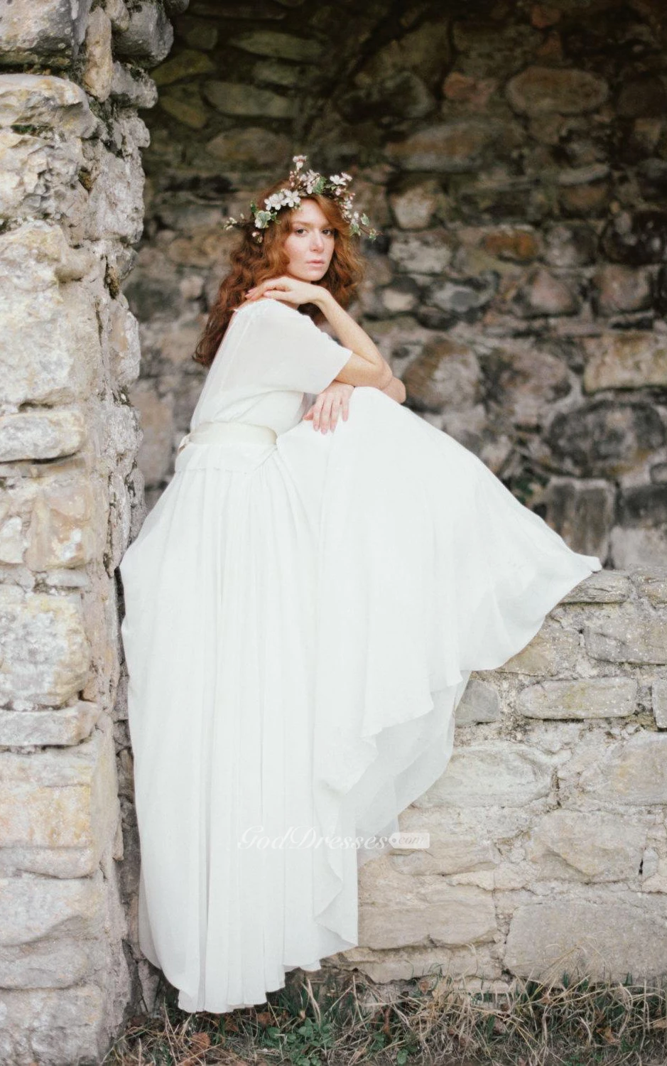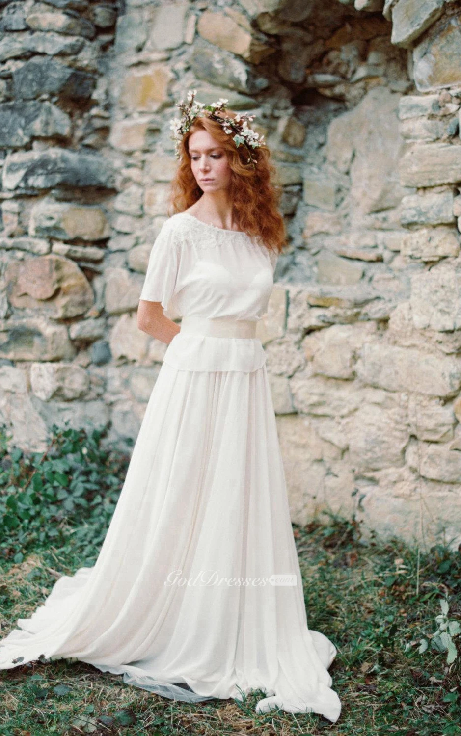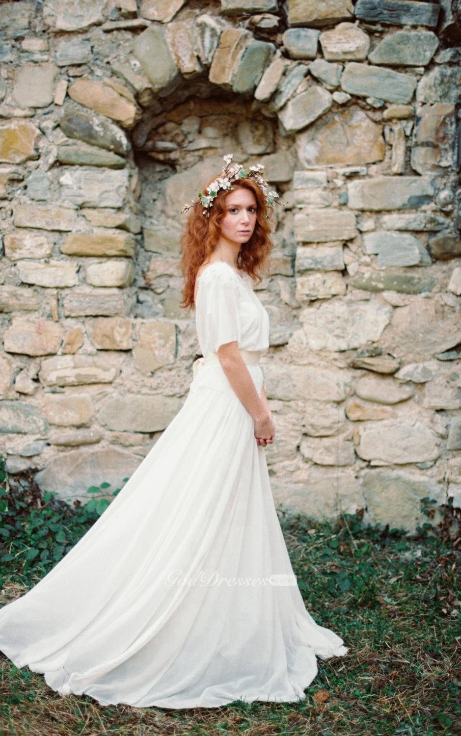 Short Sleeve Bateau Neck A-Line Chiffon Dress With Lace Embellishment