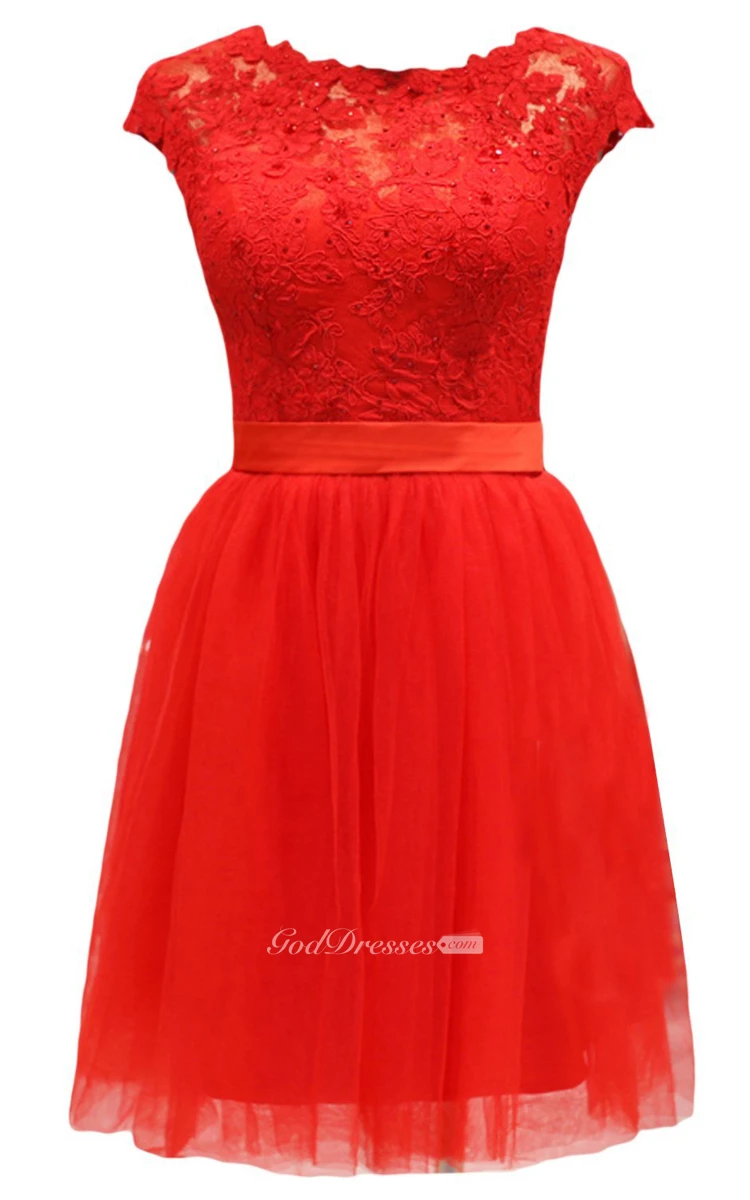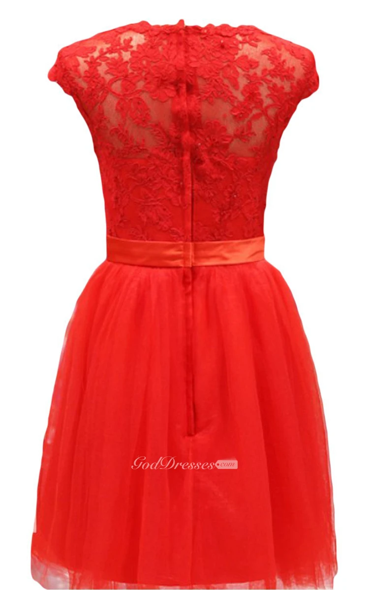 Short-sleeve Lace Bodice Dress With Satin Sash