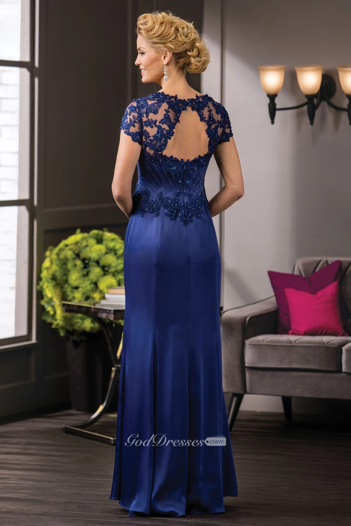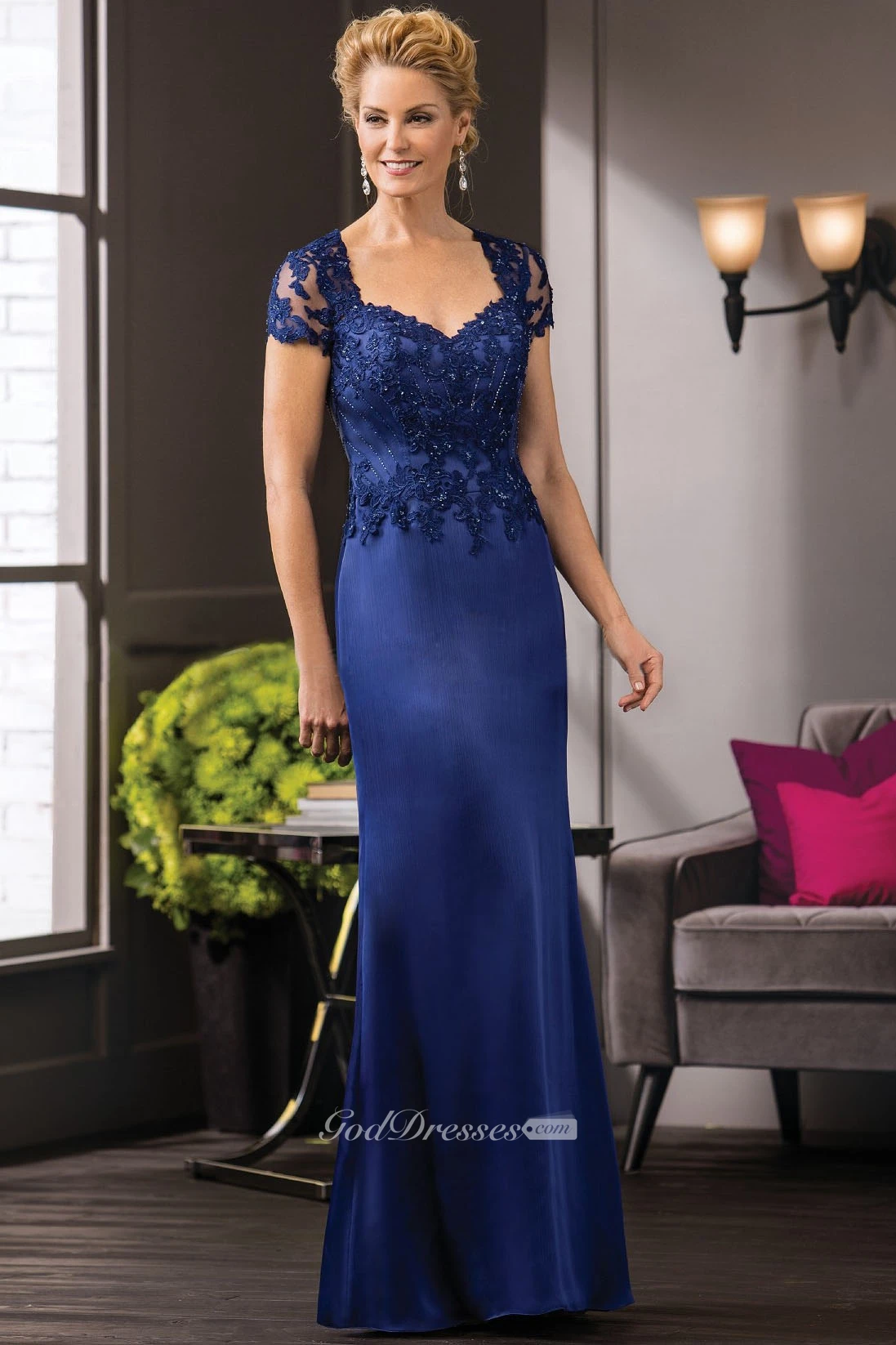 Short-Sleeved Long Mother Of The Bride Dress With Appliques And Jewels