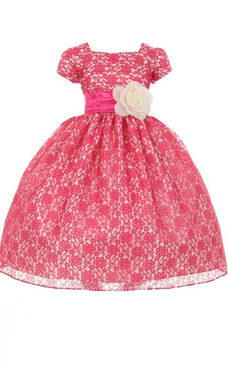 Short-sleeved Square-neck A-line Dress With Belt and Flower