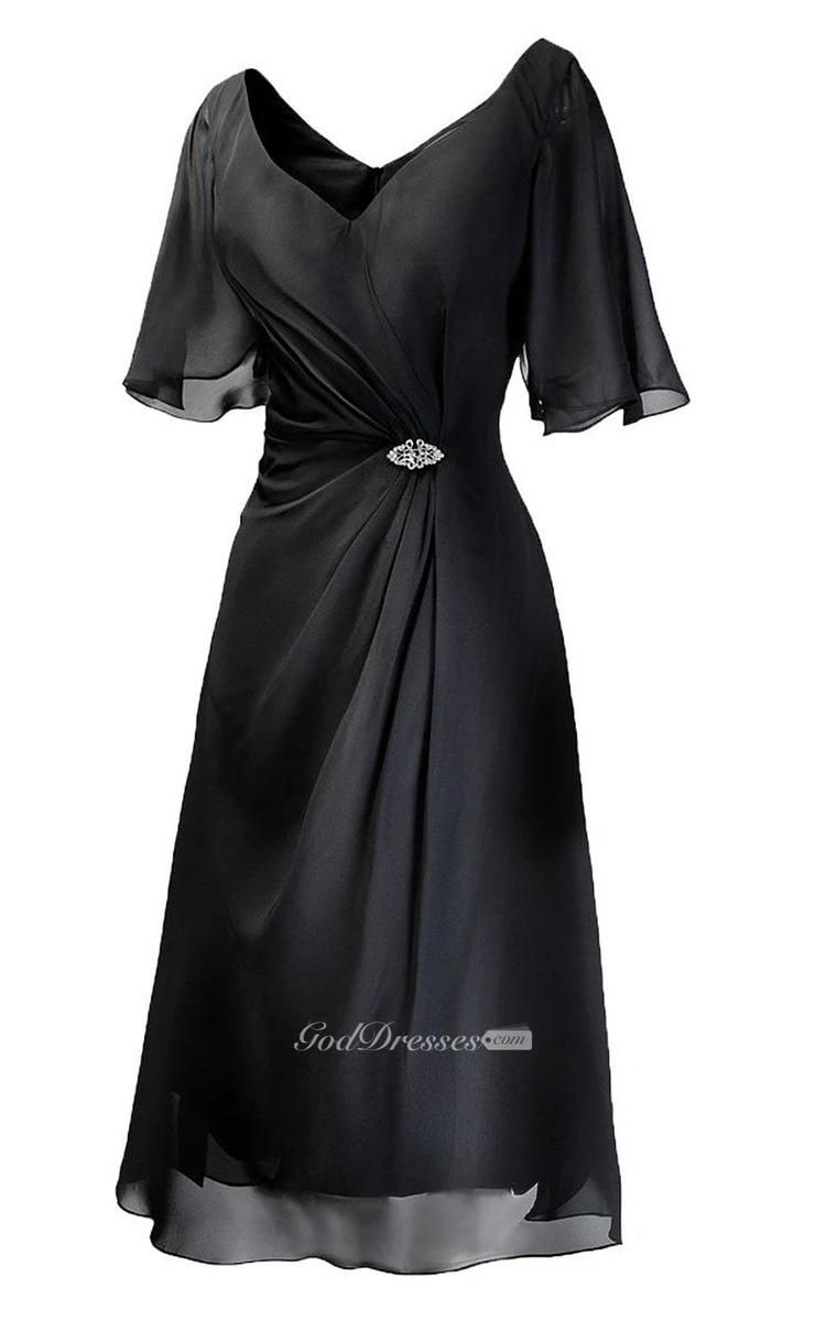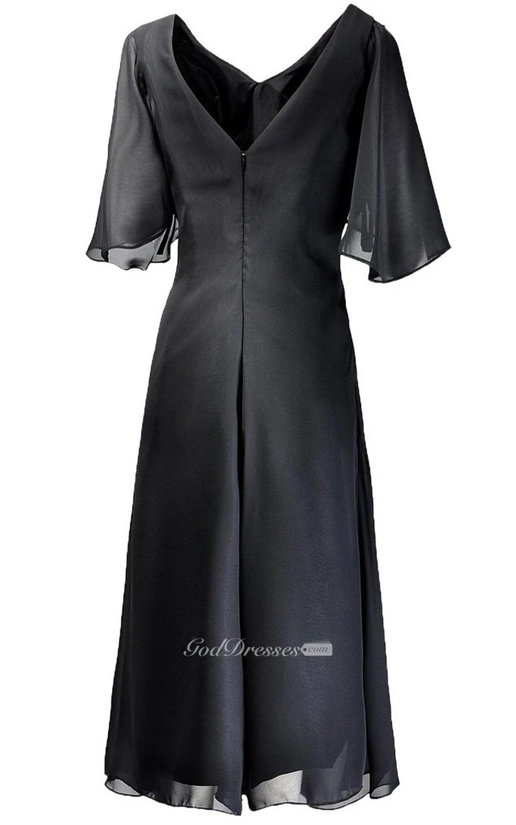 Perfect mother of the groom/bride dress! Tea length in simple style makes this dress appropriate for aged ladies while bell sleeves add a unique touch. Fabric used is high quality chiffon that feels great on skin. Color options offer flexibility of choice.
