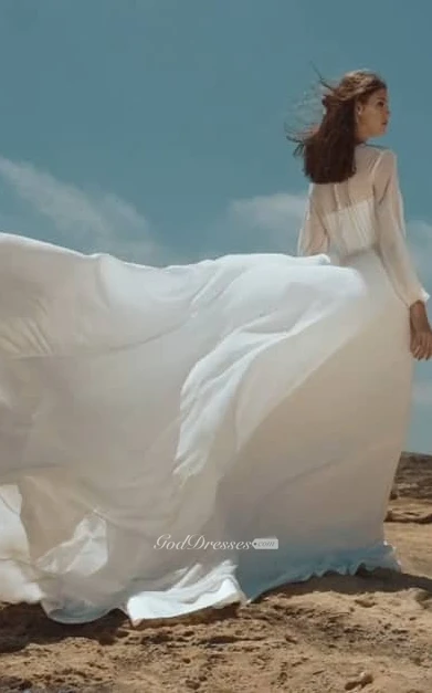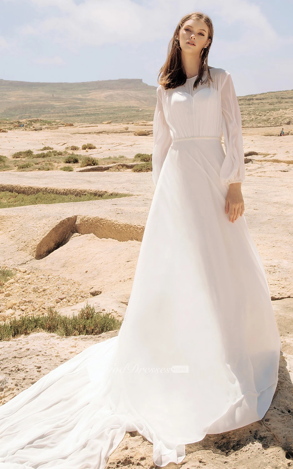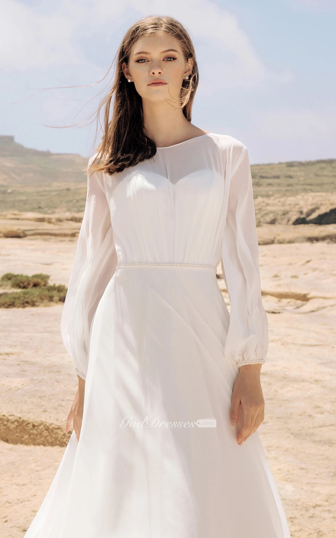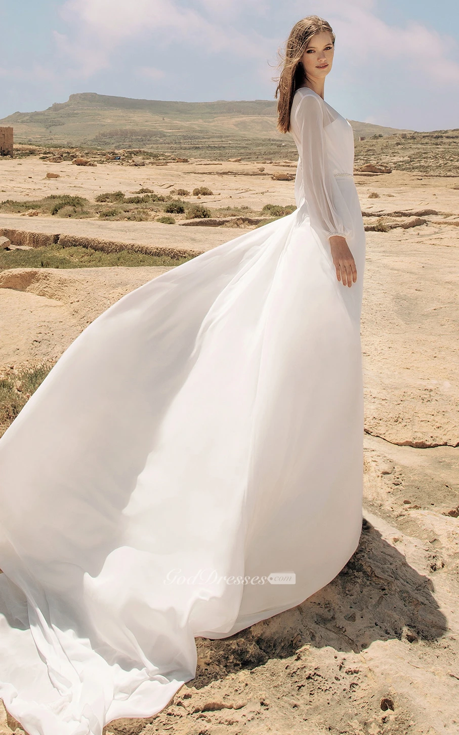Simple A Line Chiffon Long Sleeve Illusion Poet Wedding Dress with Ruching