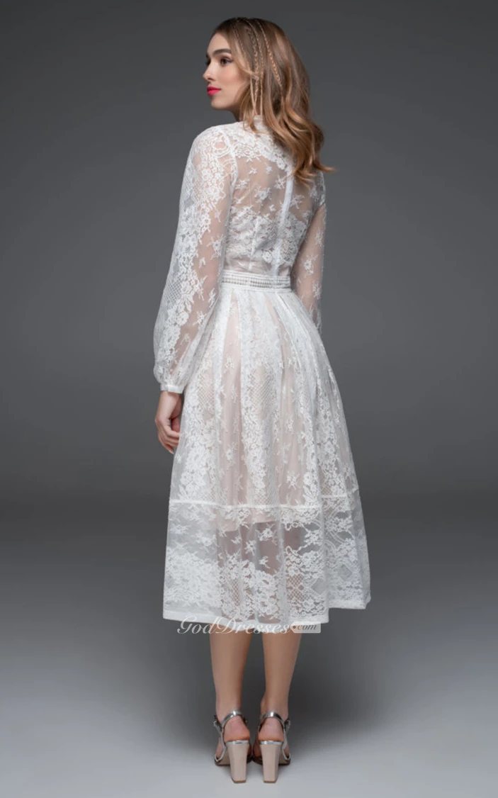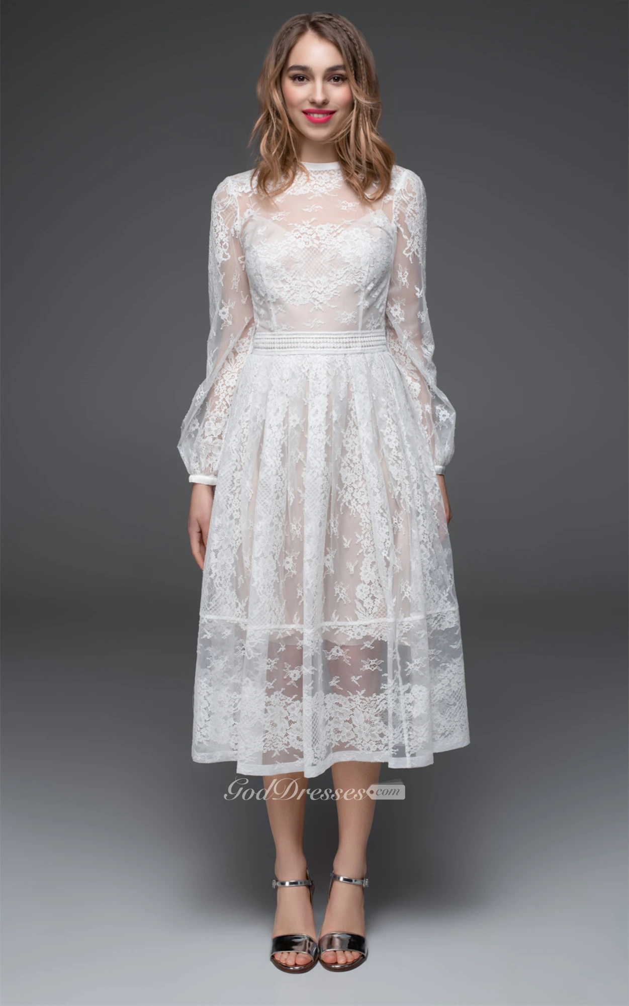 Simple A Line High Neck Lace Tea-length Wedding Dress with Appliques