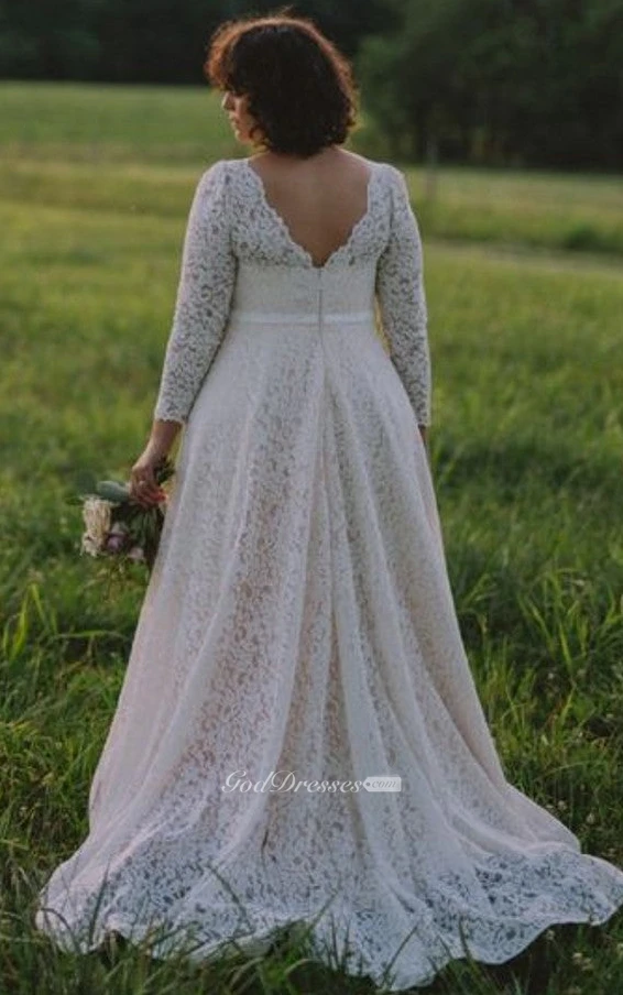 Simple A Line Lace Floor-length Long Sleeve Low-V Back Wedding Dress