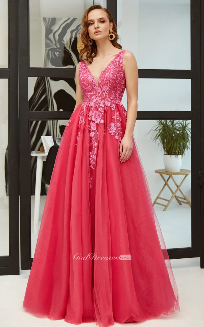 Simple A Line Lace V-neck Floor-length Open Back Evening Dress with Appliques