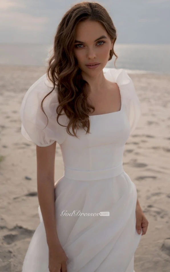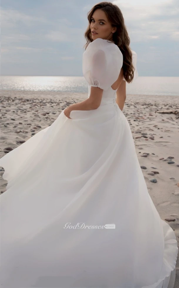 Simple A Line Scoop Chiffon Court Train Wedding Dress with Ruching
