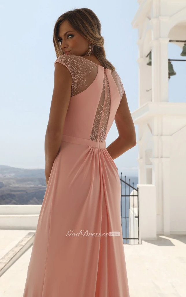 Simple Bateau Chiffon Sheath Short Sleeve Floor-length Formal Dress with Beading