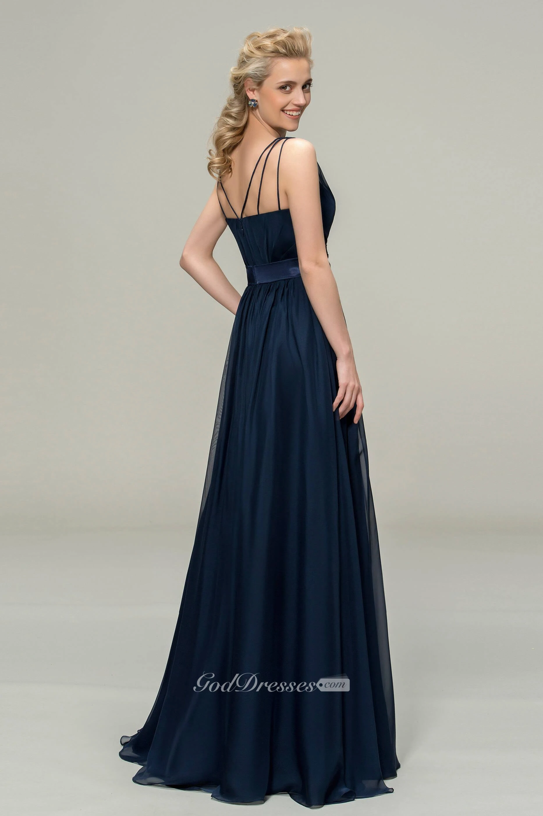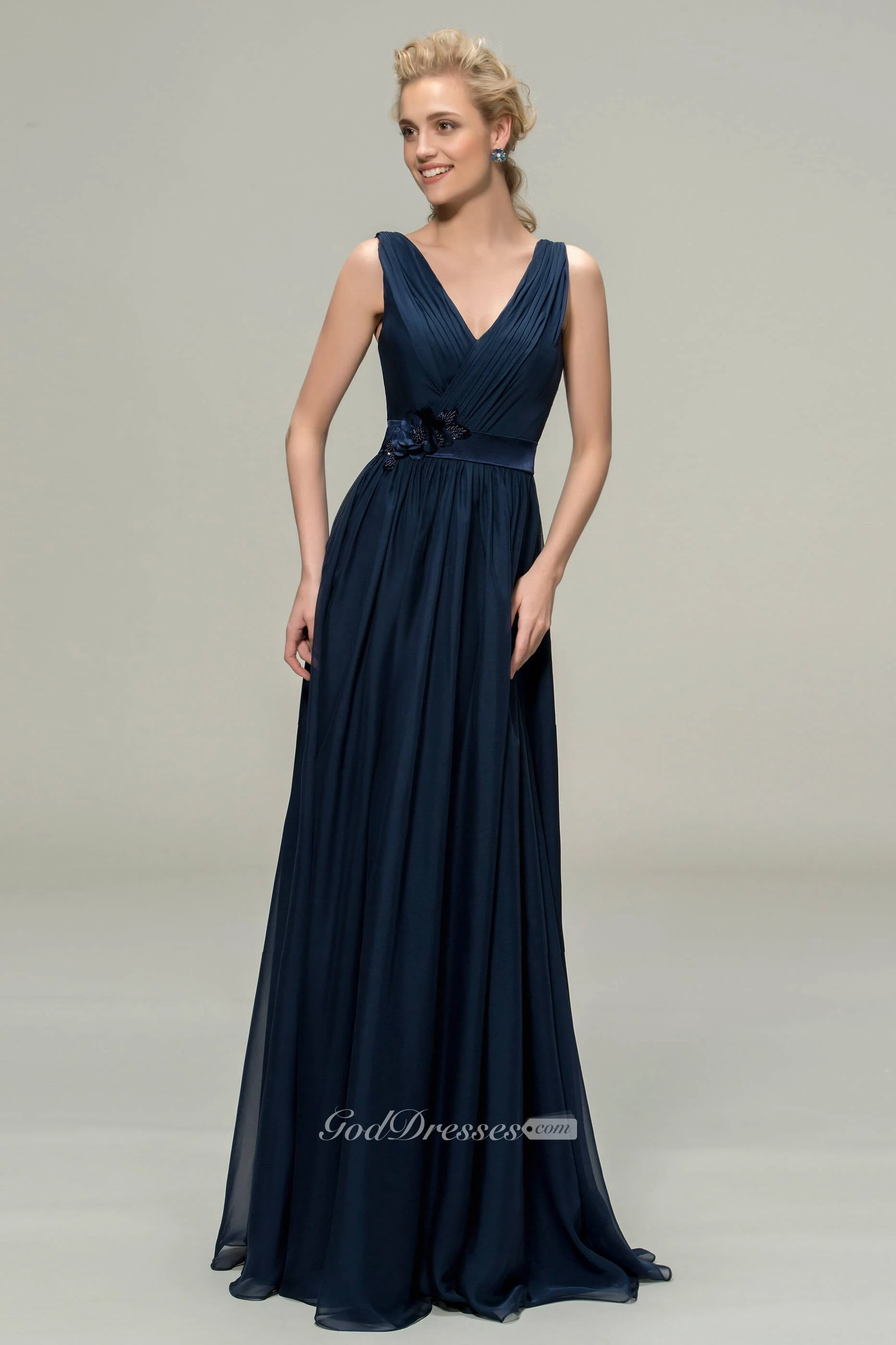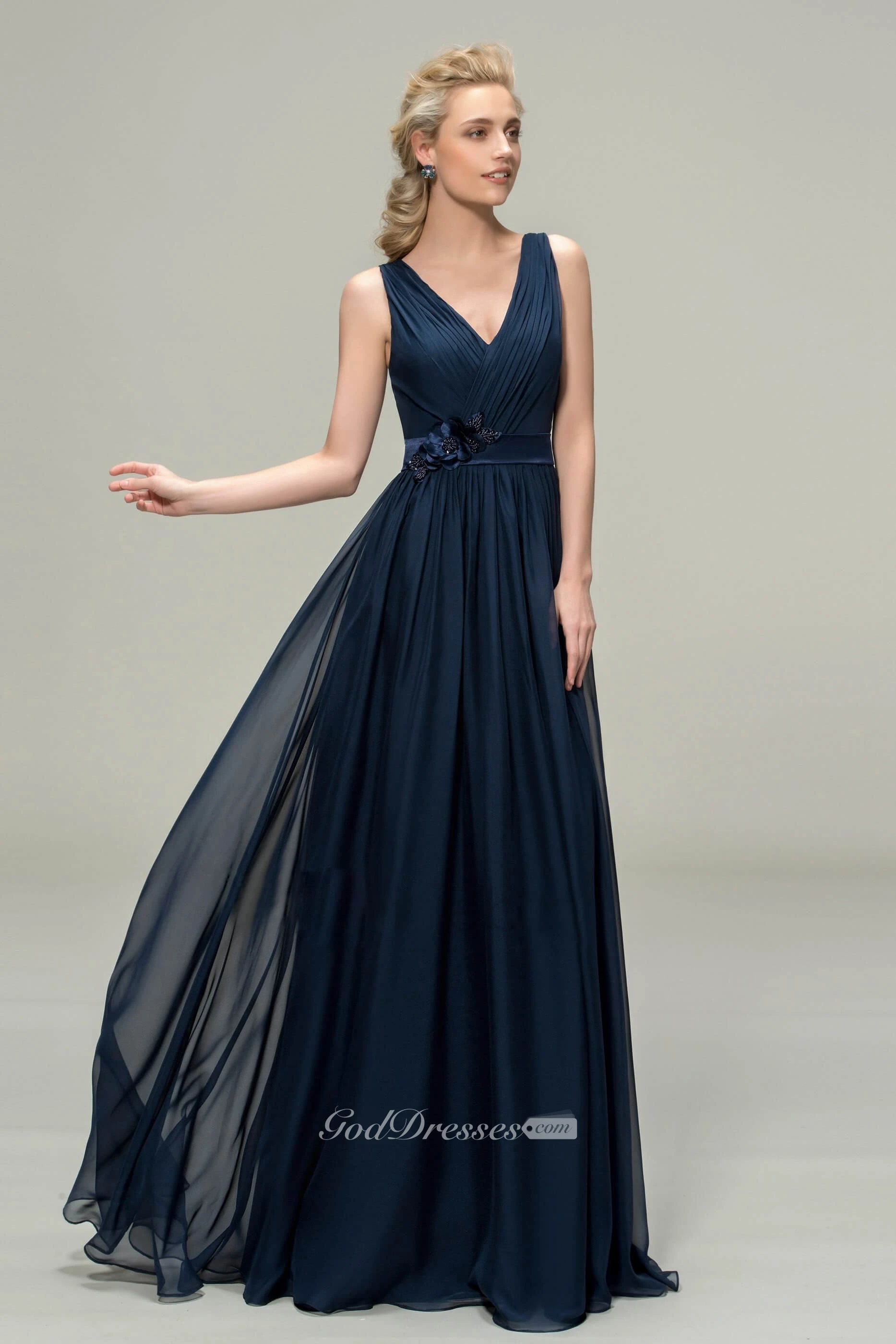 Simple Chiffon Sleeveless V-neck Floor-length Dress With Floral Appliques And Sash