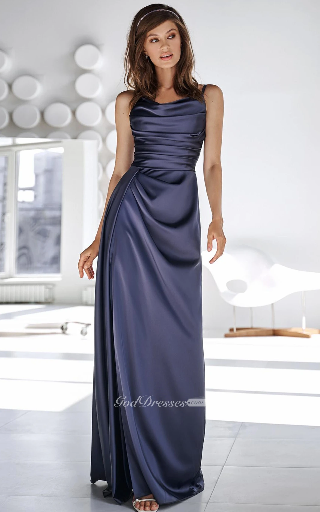 Simple Cowel Sheath Satin Floor-length Prom Dress with Ruching and Split Front