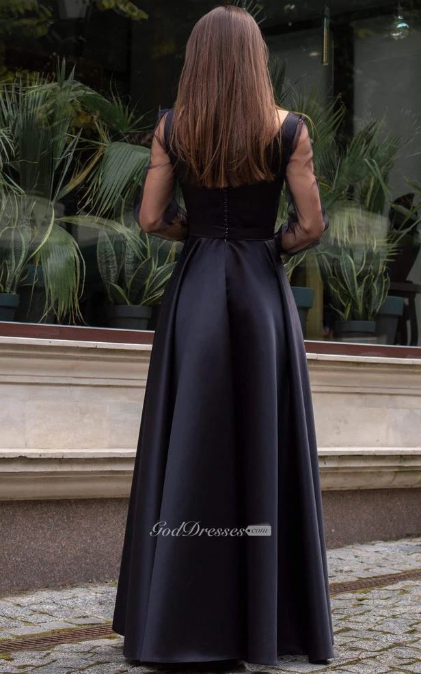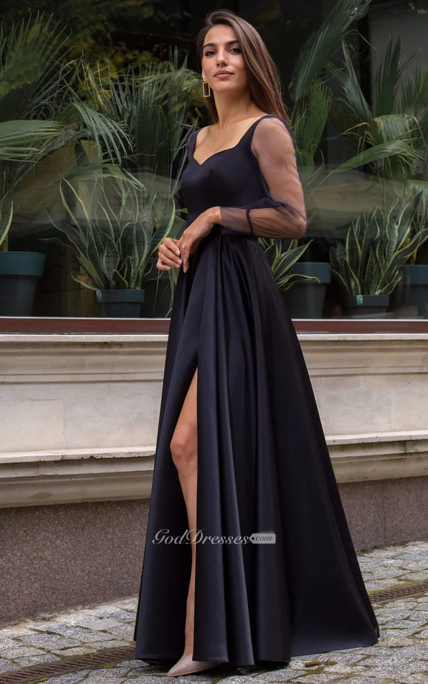 Simple Floor-length Long Sleeve Satin A Line Formal Dress with Split Front