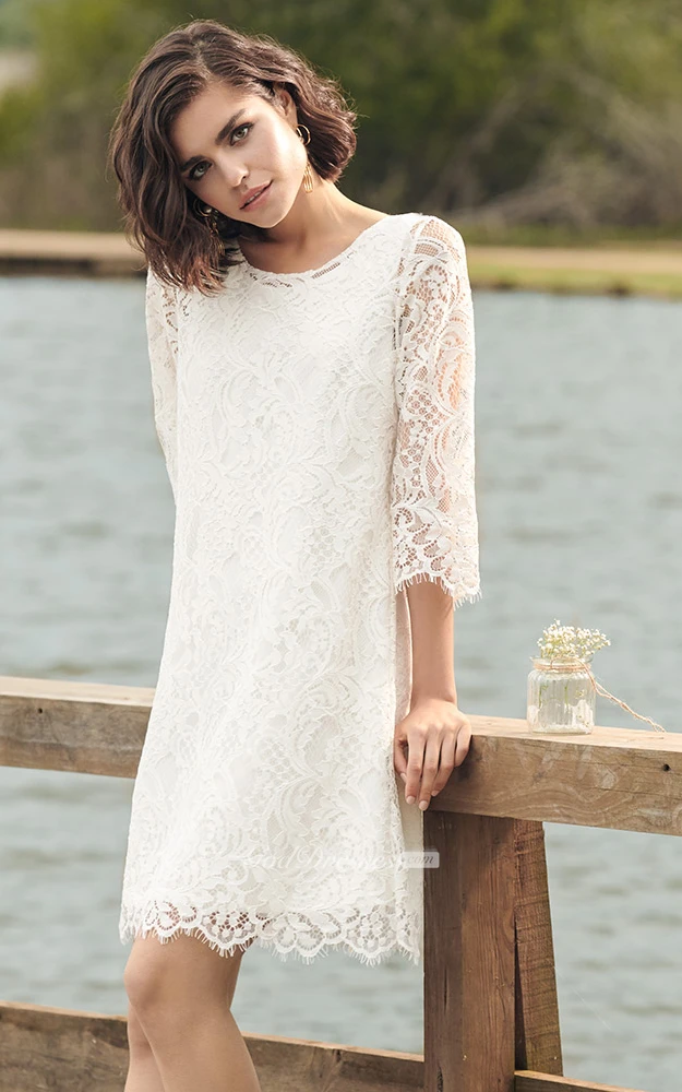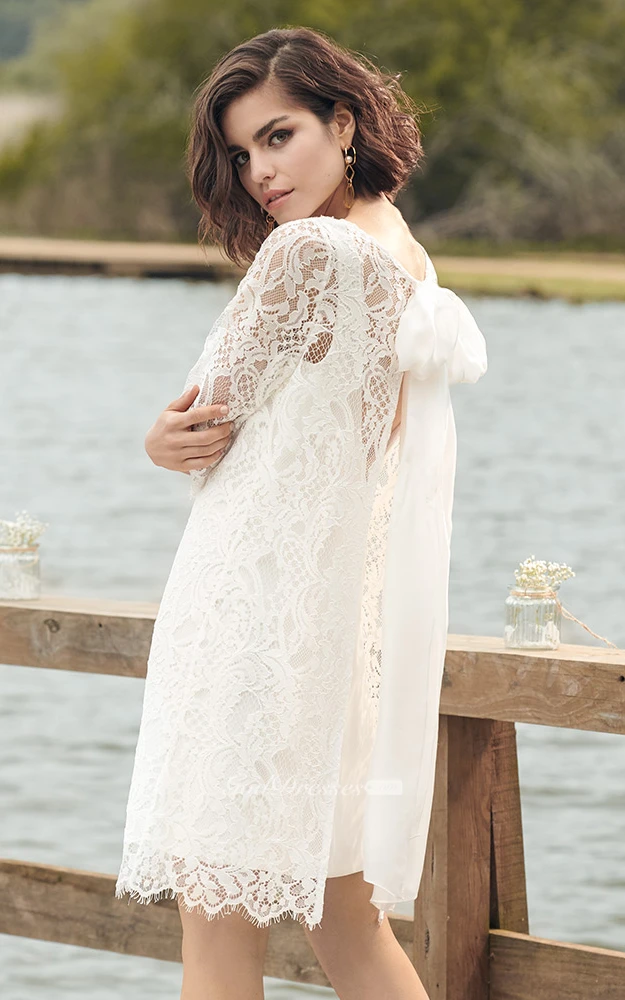 Simple Lace A Line Knee-length 3/4 Length Sleeve Wedding Dress with Bow