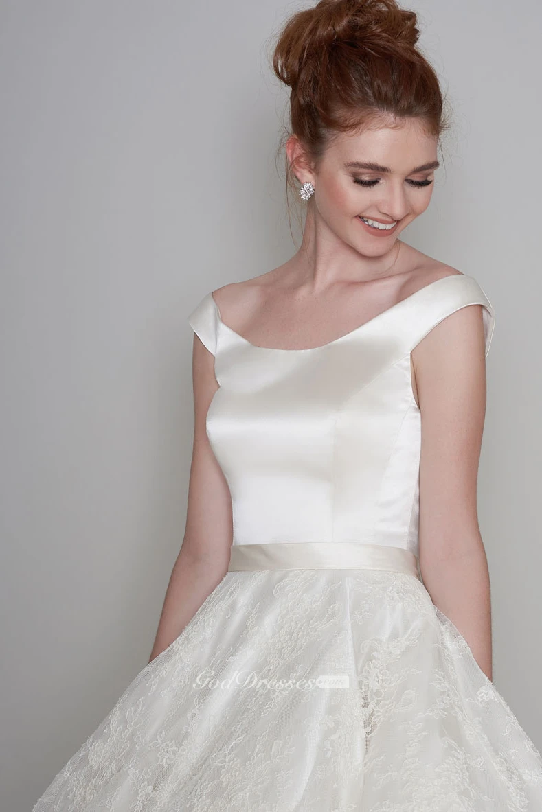 Simple Satin and Lace Cap-Sleeve Tea-length Bridal Gown with Bow