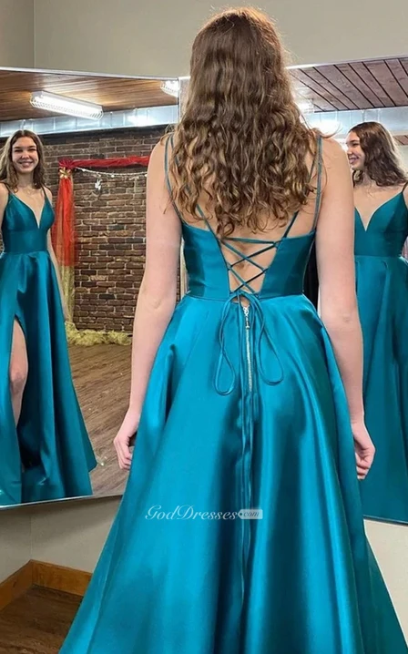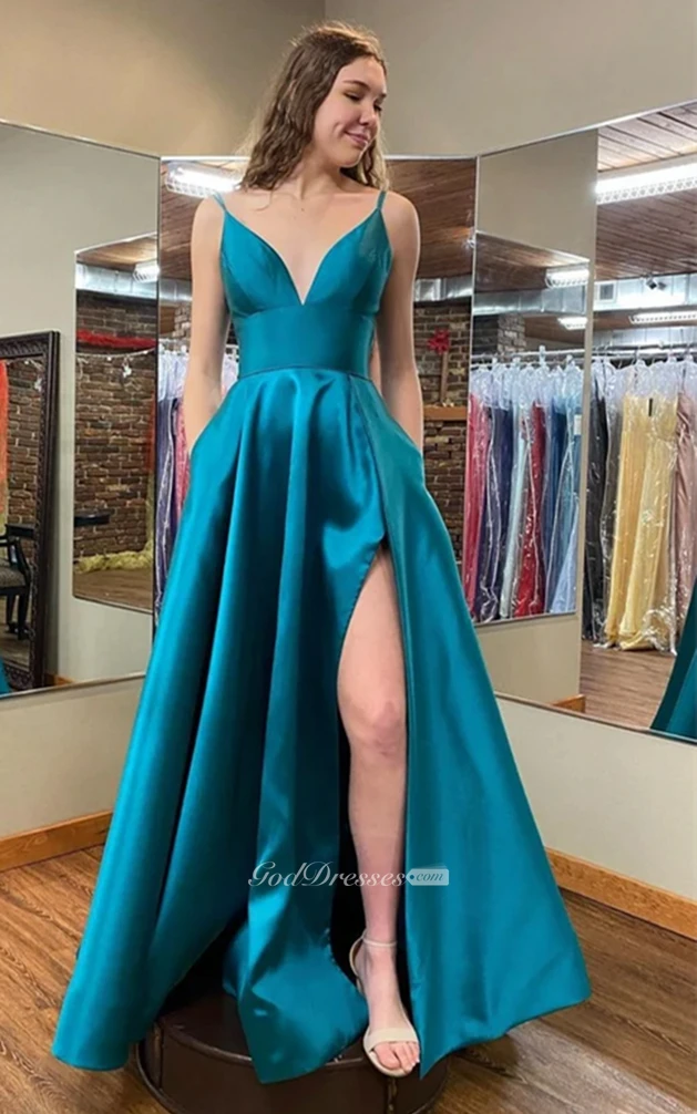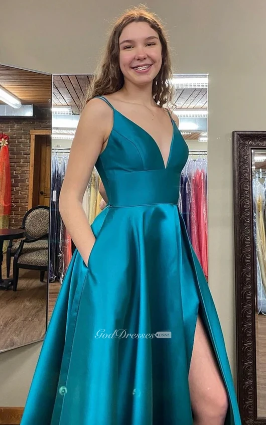 Simple Sleeveless Floor-length A Line Satin Open Back Evening Dress with Pockets