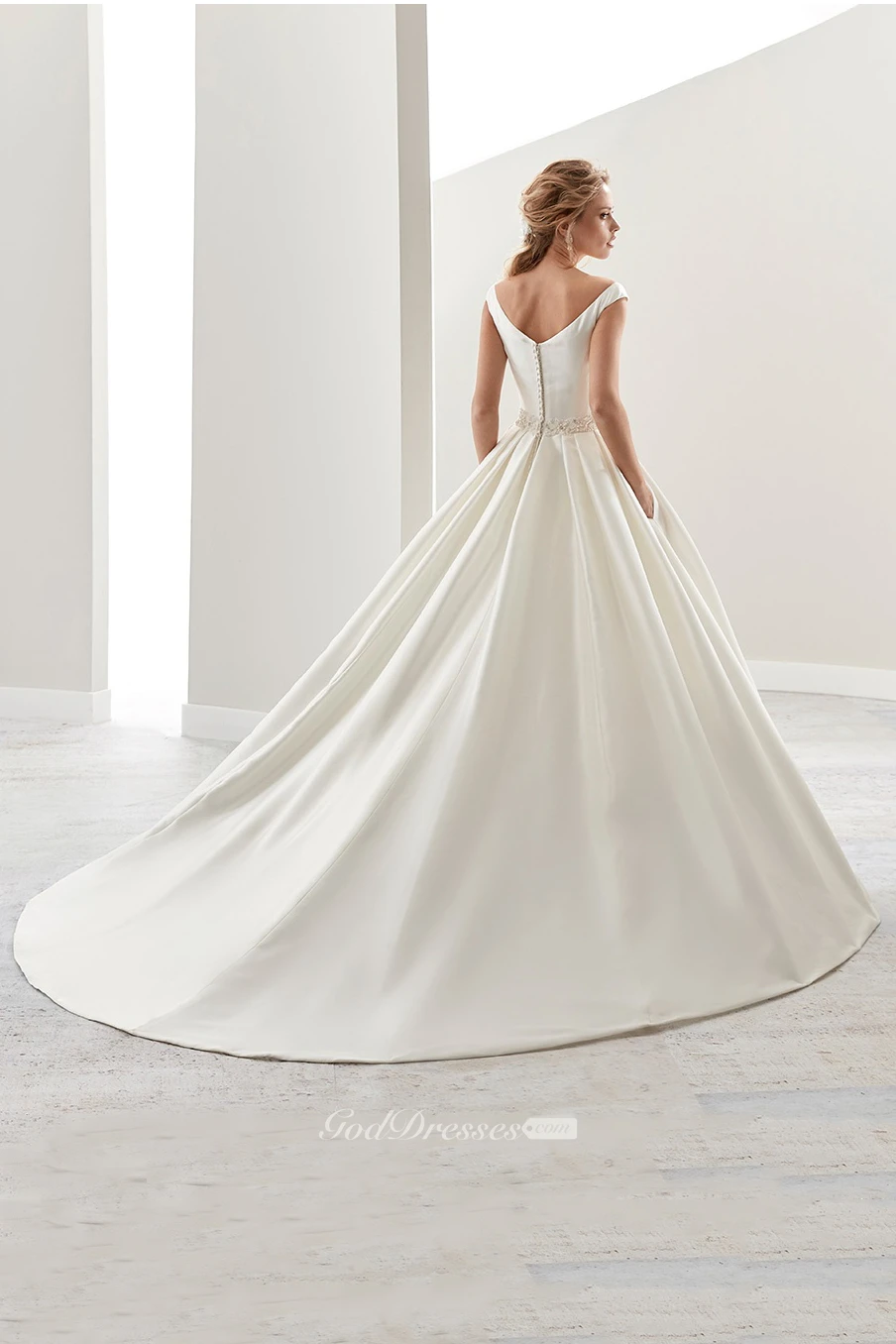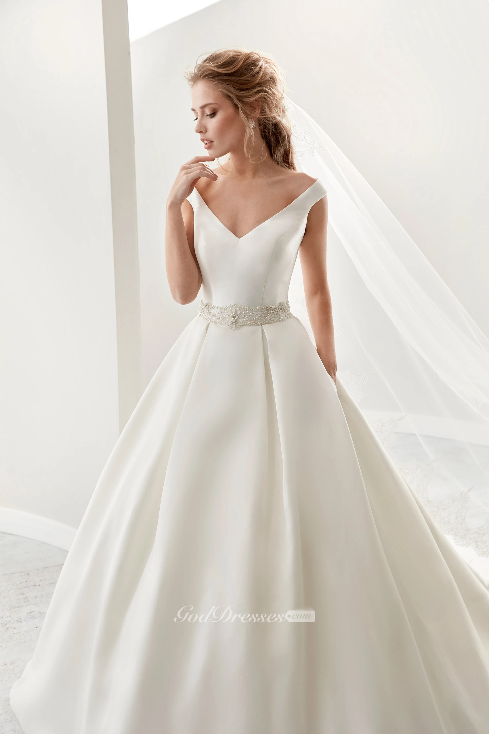 Simple V-Neck A-Line Satin Wedding Dress With Beaded Belt And Brush Train
