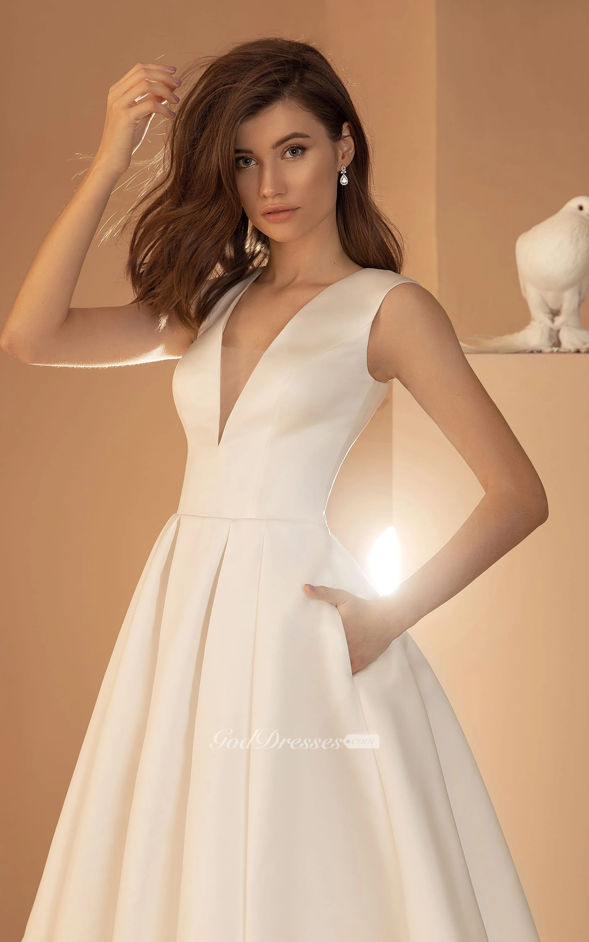 Simple V-neck Satin Ball Gown Sleeveless Floor-length Sweep Train Wedding Dress with Pockets