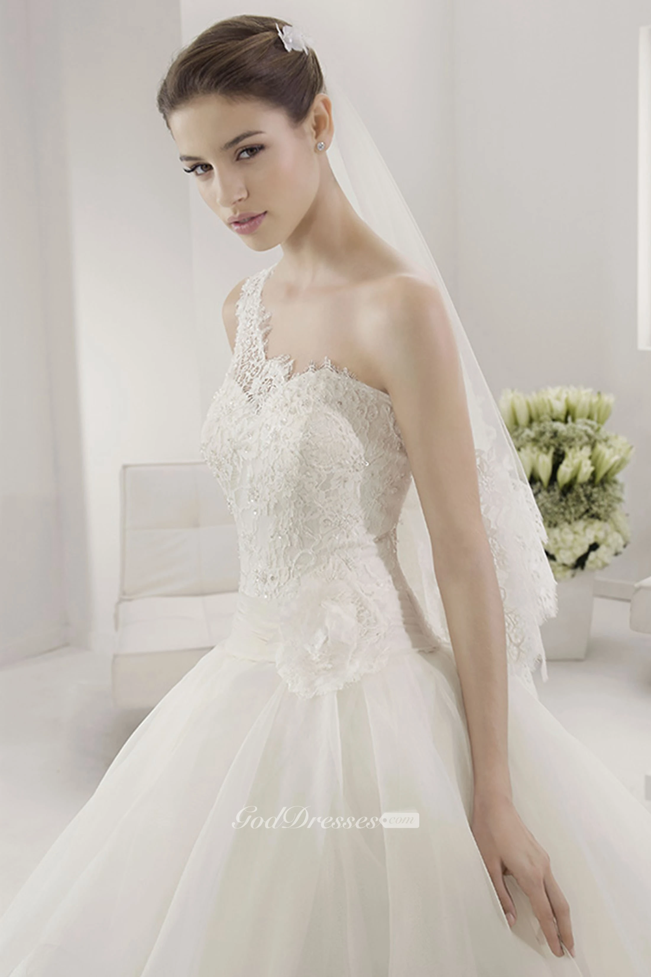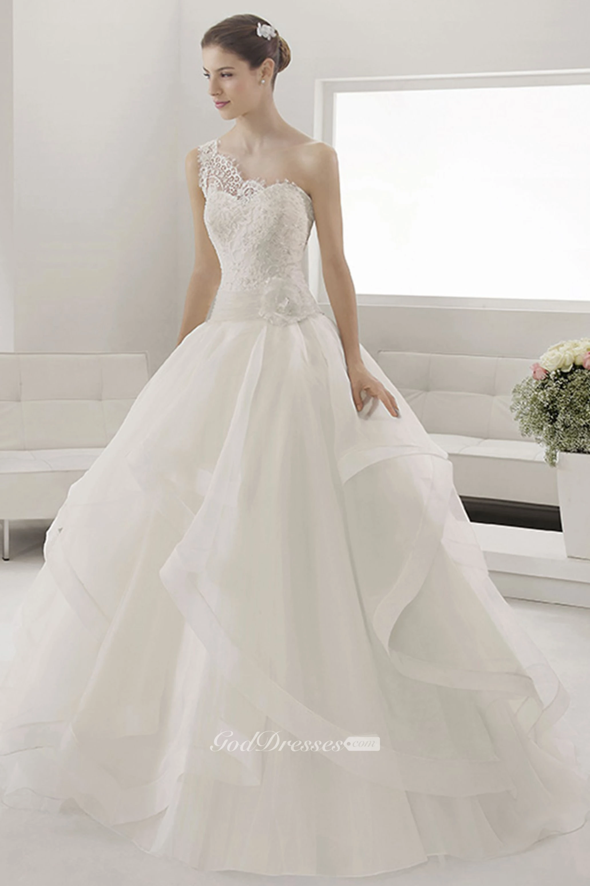 Single Strap Bridal Gown With Lace Top And Layered Organza Skirt