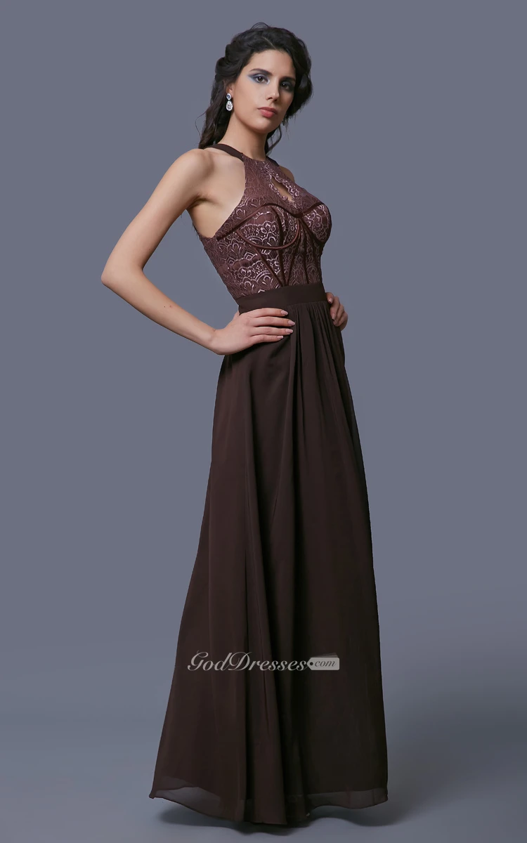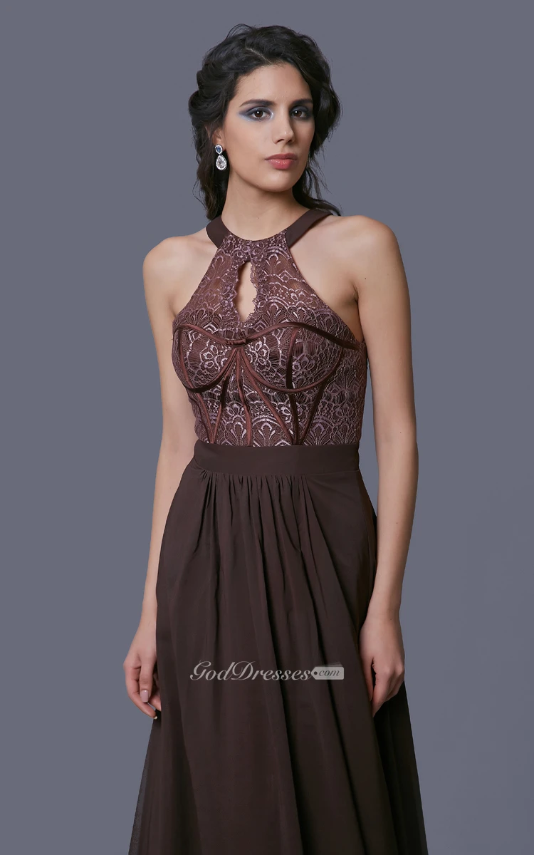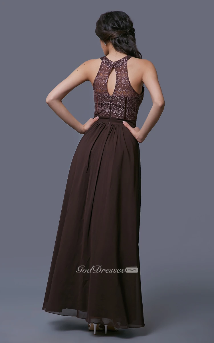Sleeveless A-Line Chiffon Dress With Keyhole Back and Lace Bodice