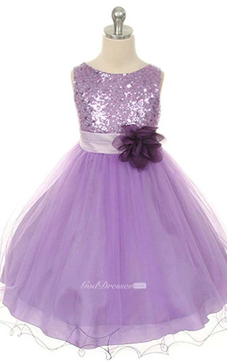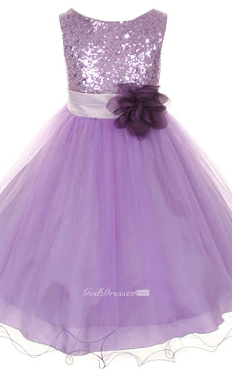 Sleeveless A-line Dress With Sequined Bodice and Flower