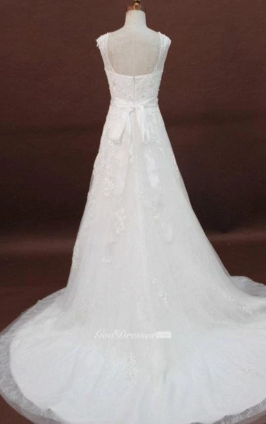 Sleeveless A-Line Lace and Tulle Dress With Bateau Neckline and Back Bow