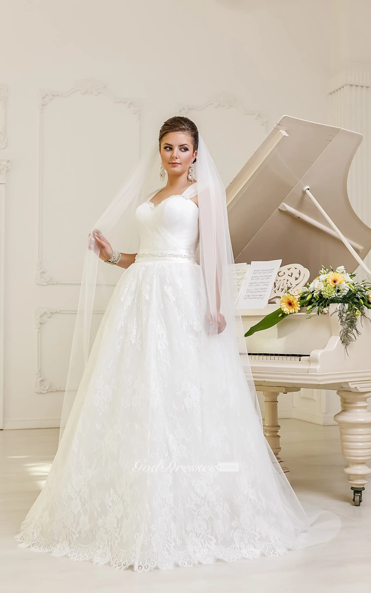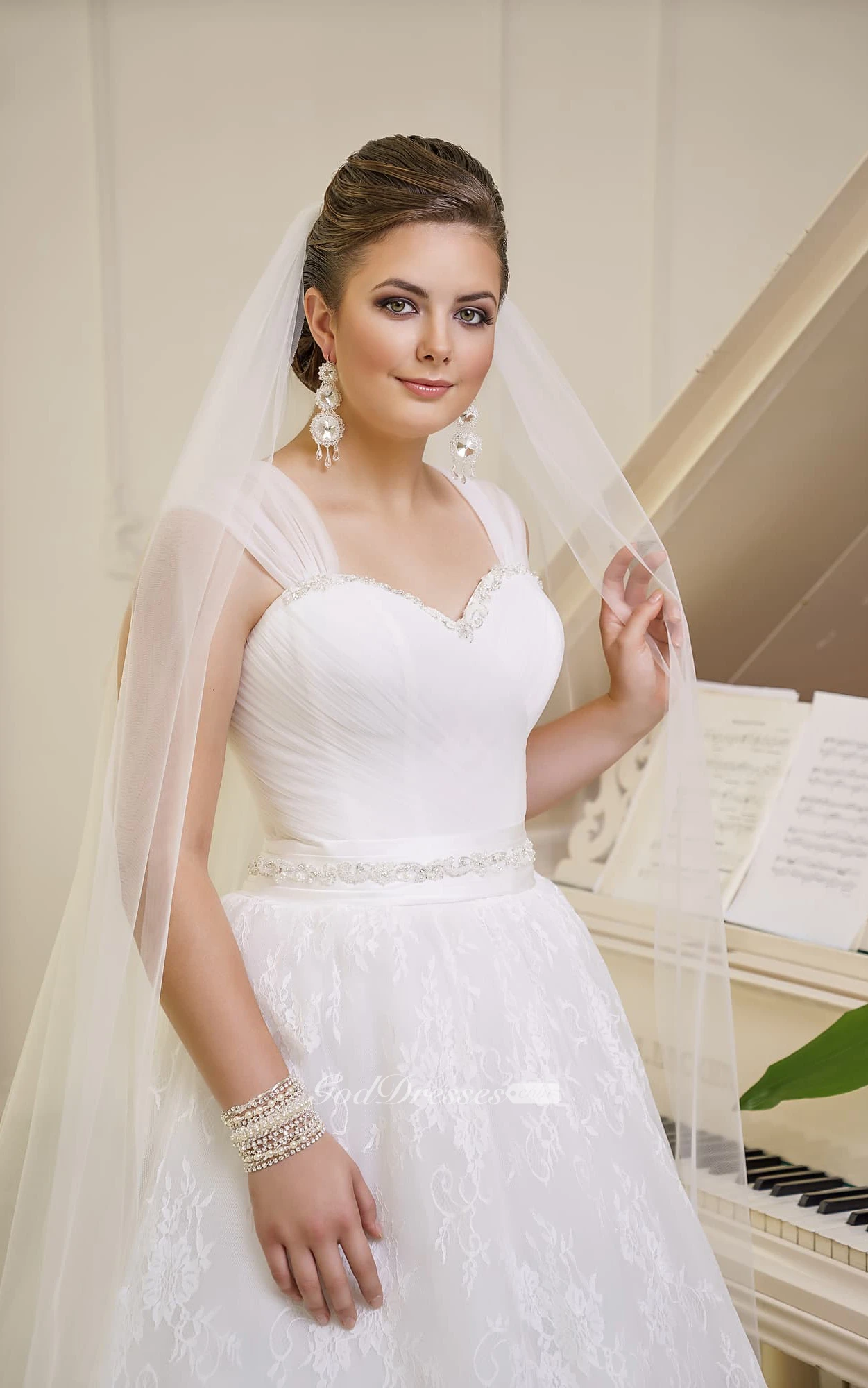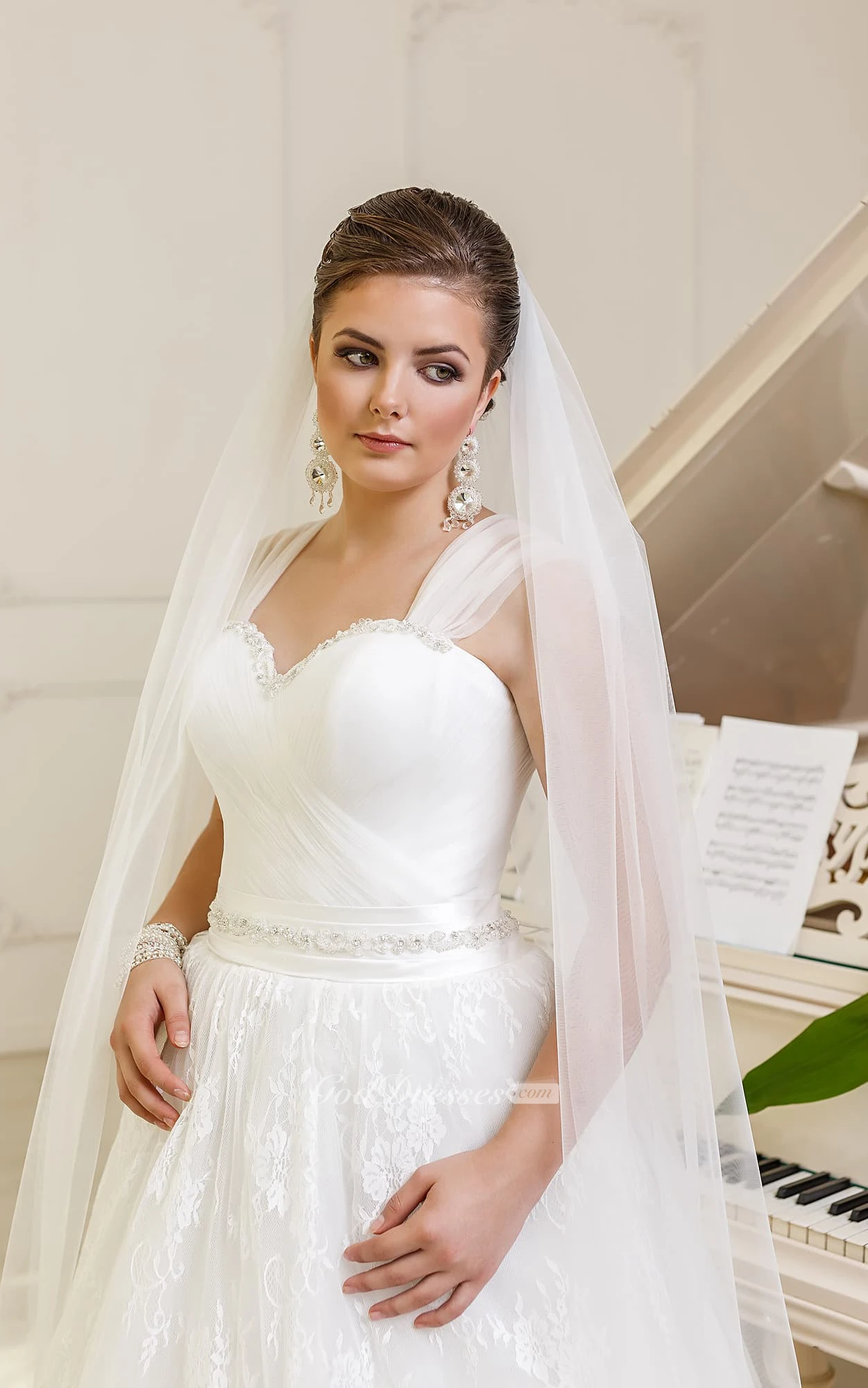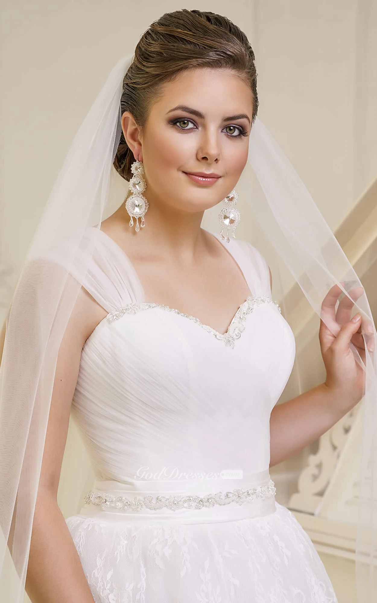 Sleeveless A-line Lace Wedding Dress With Ruching And Beaded Waist