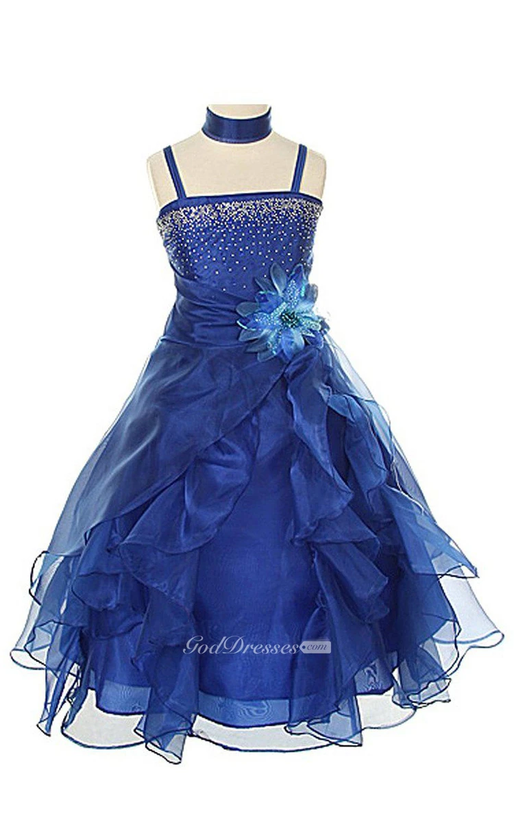 Sleeveless A-line Organza Dress With Ruffles and Flower