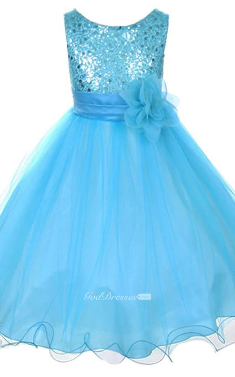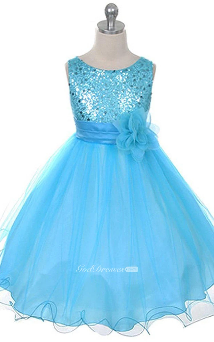 Sleeveless A-line Organza Dress With Sequins and Flower