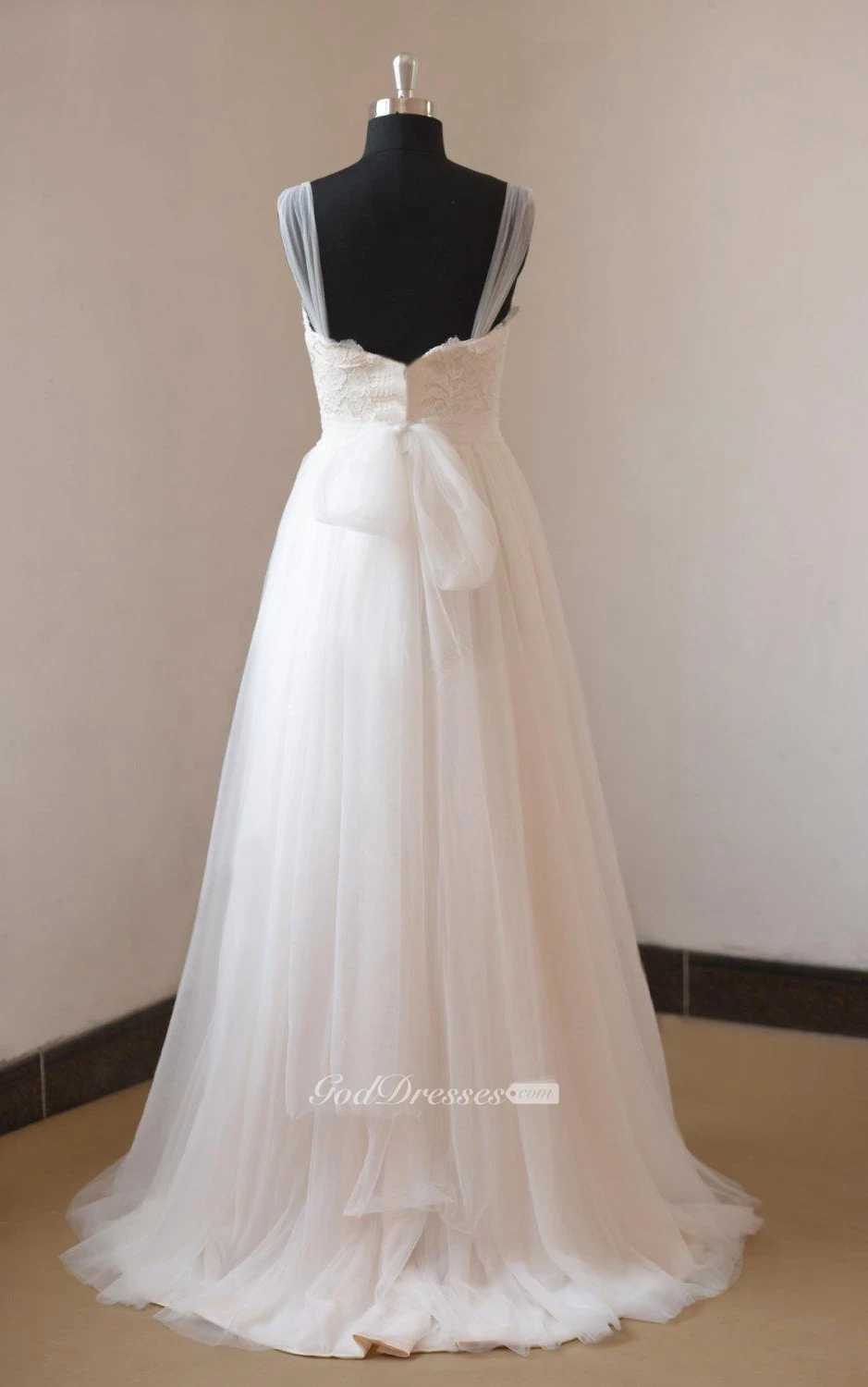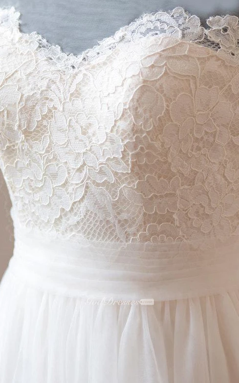 Sleeveless A-Line Pleated Tulle Gown With Lace Bodice and Bateau Neck