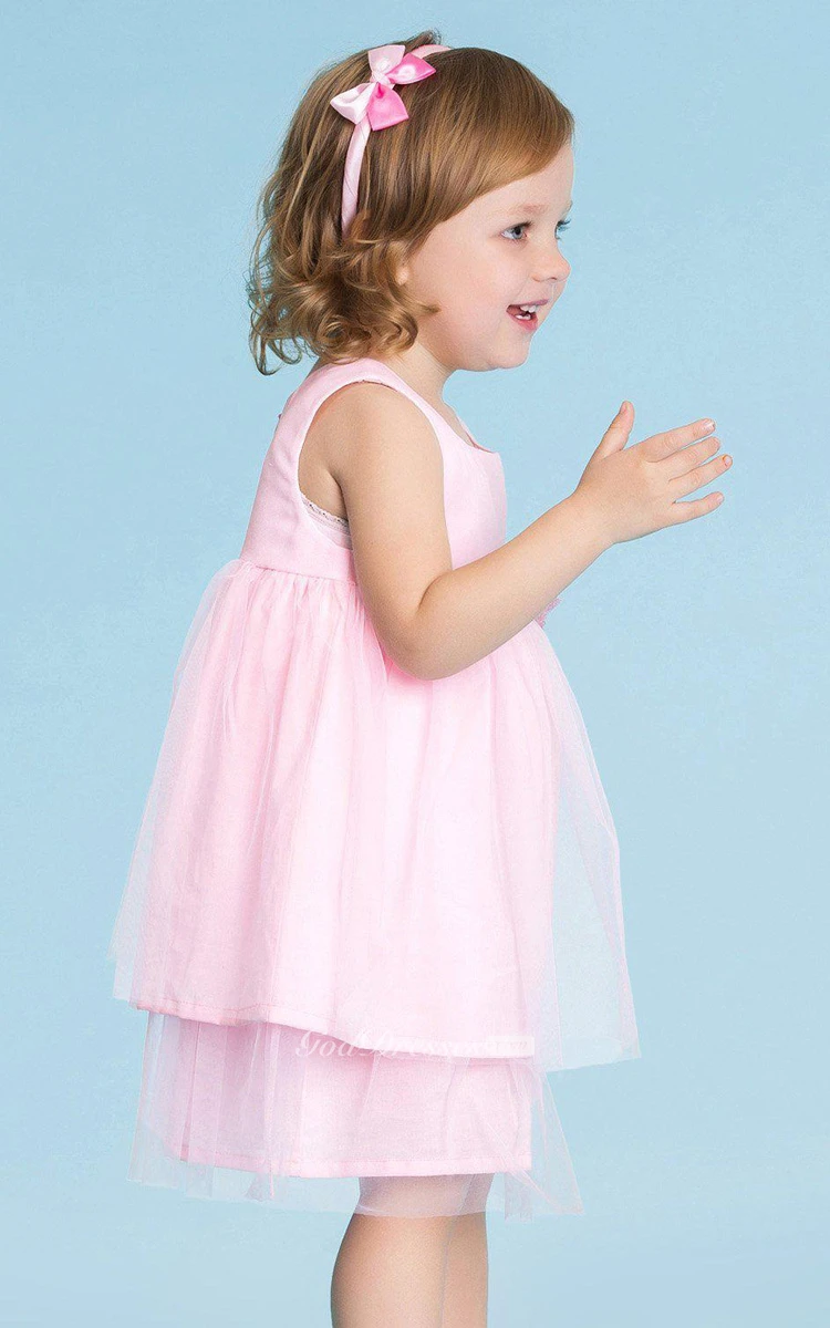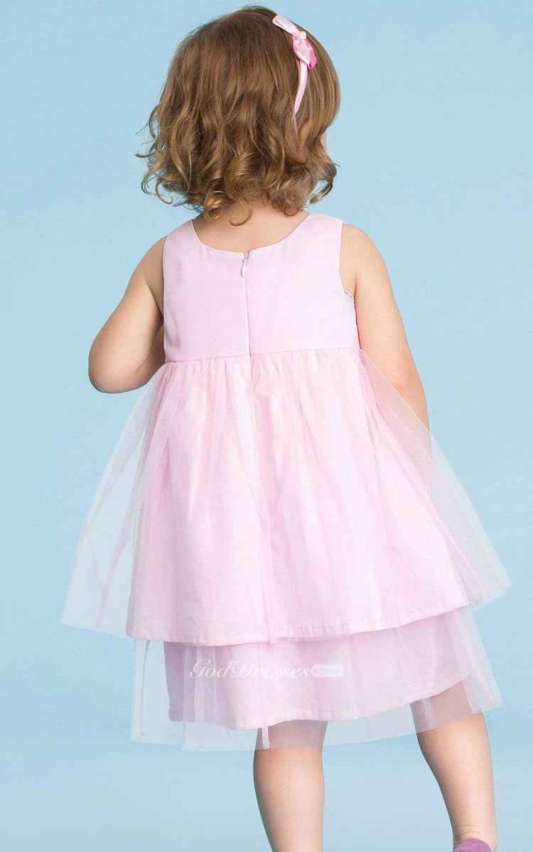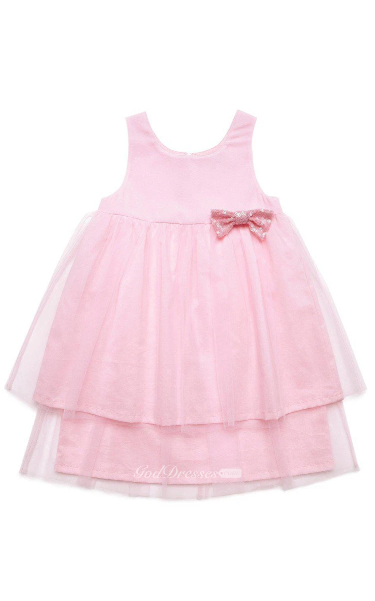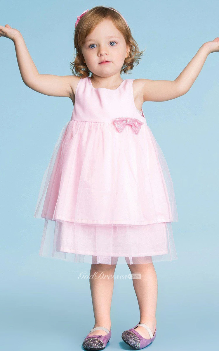 Sleeveless A-line Tiered Tulle Dress With Pleats and Bow