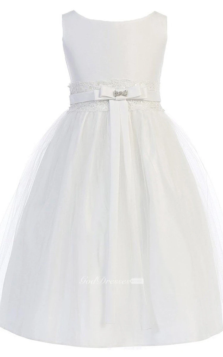 Sleeveless A-line Tulle Dress With Bow and Appliques