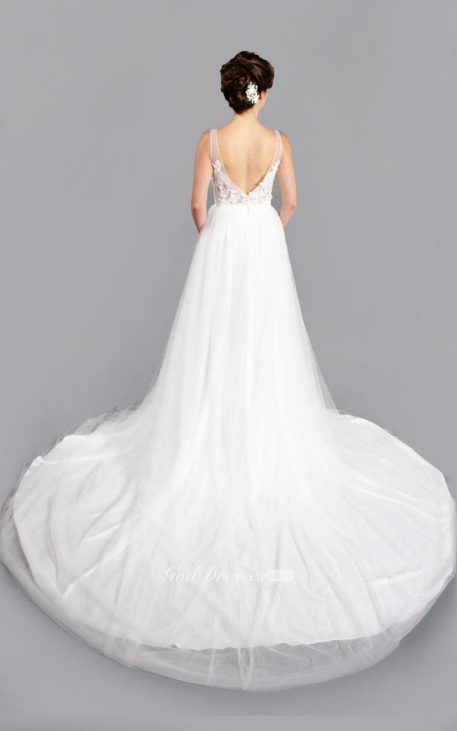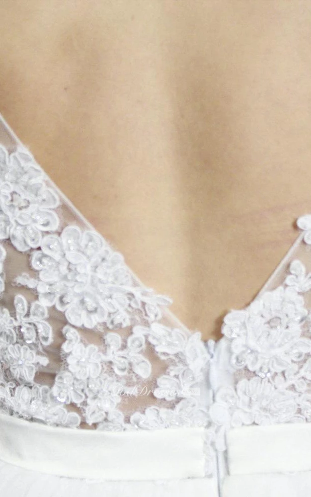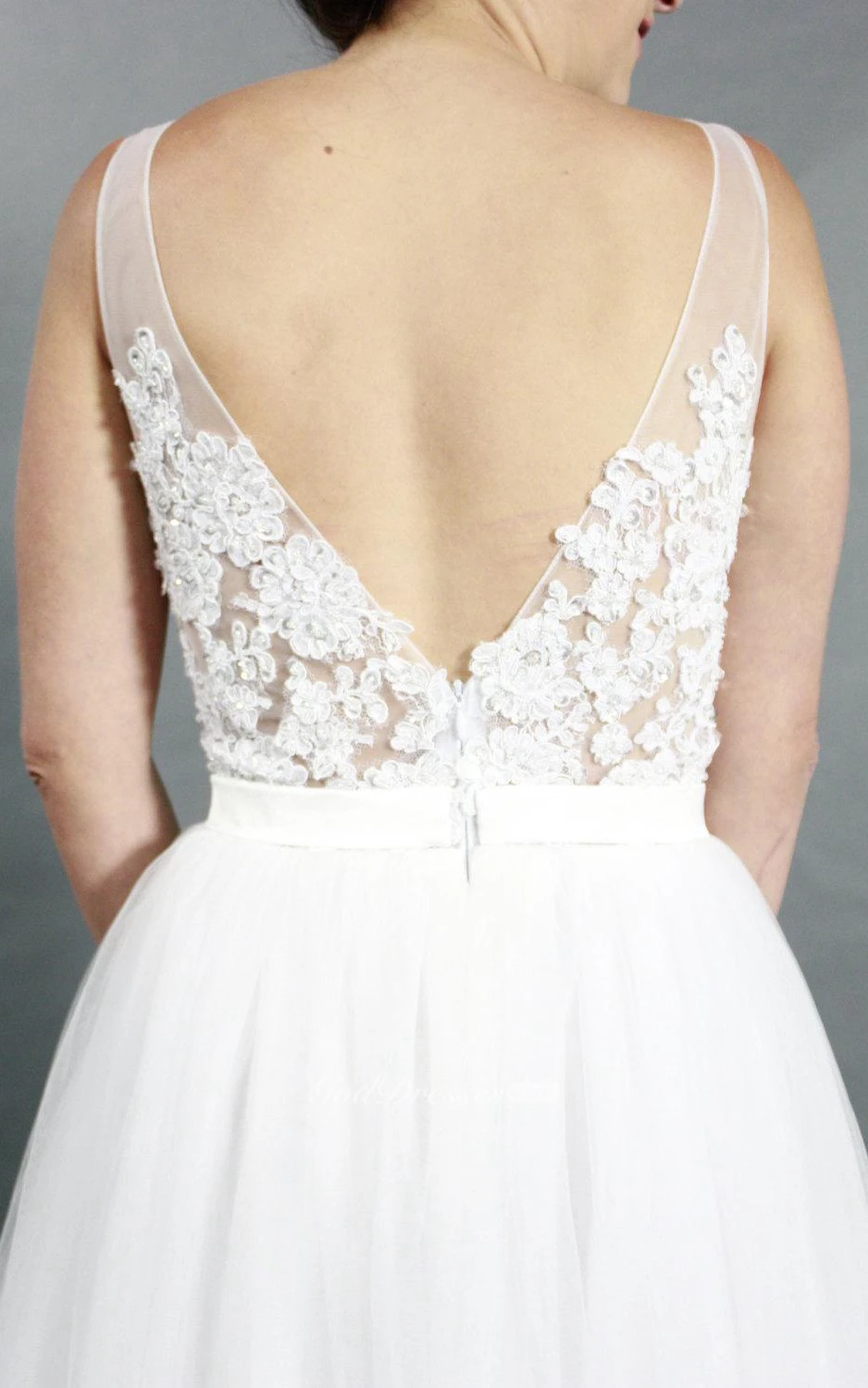 Sleeveless A-Line V-Neck Tulle Dress With Low-V Back and Lace Bodice
