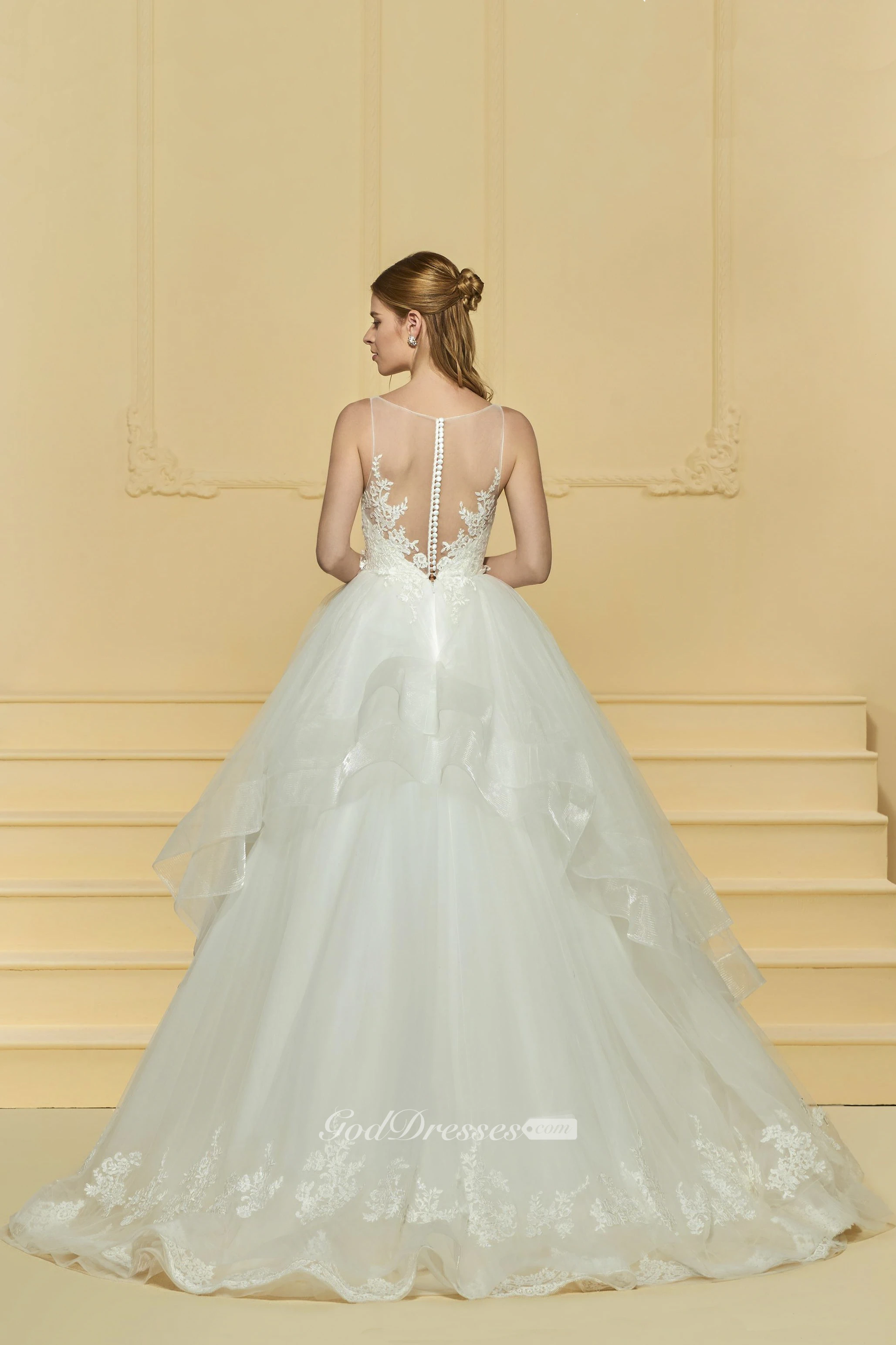 Sleeveless Adorable Lace Cute Wedding Dress With Ruflles And Illusion Button Back