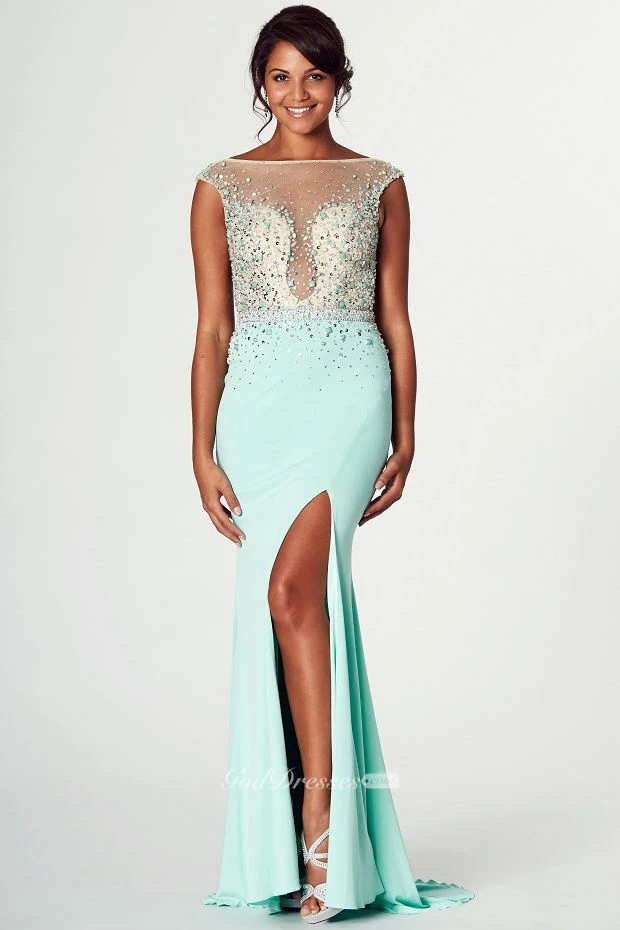 Sleeveless Beaded Bateau Neck Jersey Prom Dress