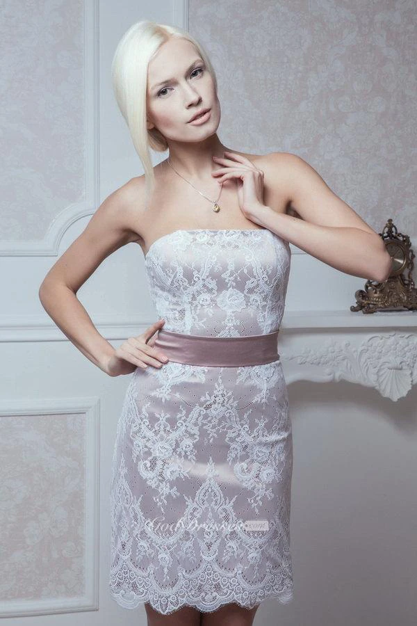 Sleeveless Column Lace Short Dress With Satin Bow Sash and Lace Up Back