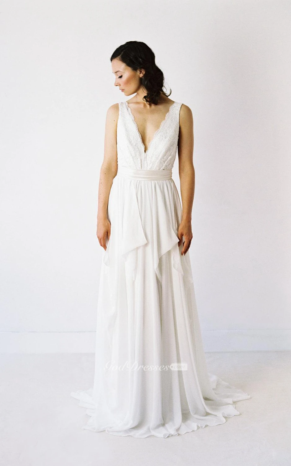 Sleeveless Deep-V Neck Chiffon Dress With Lace Bodice and Pleated Skirt