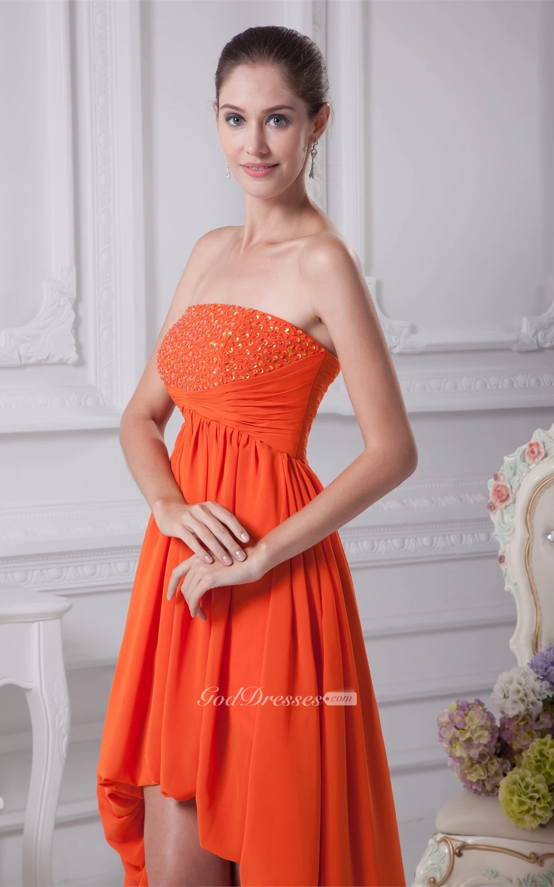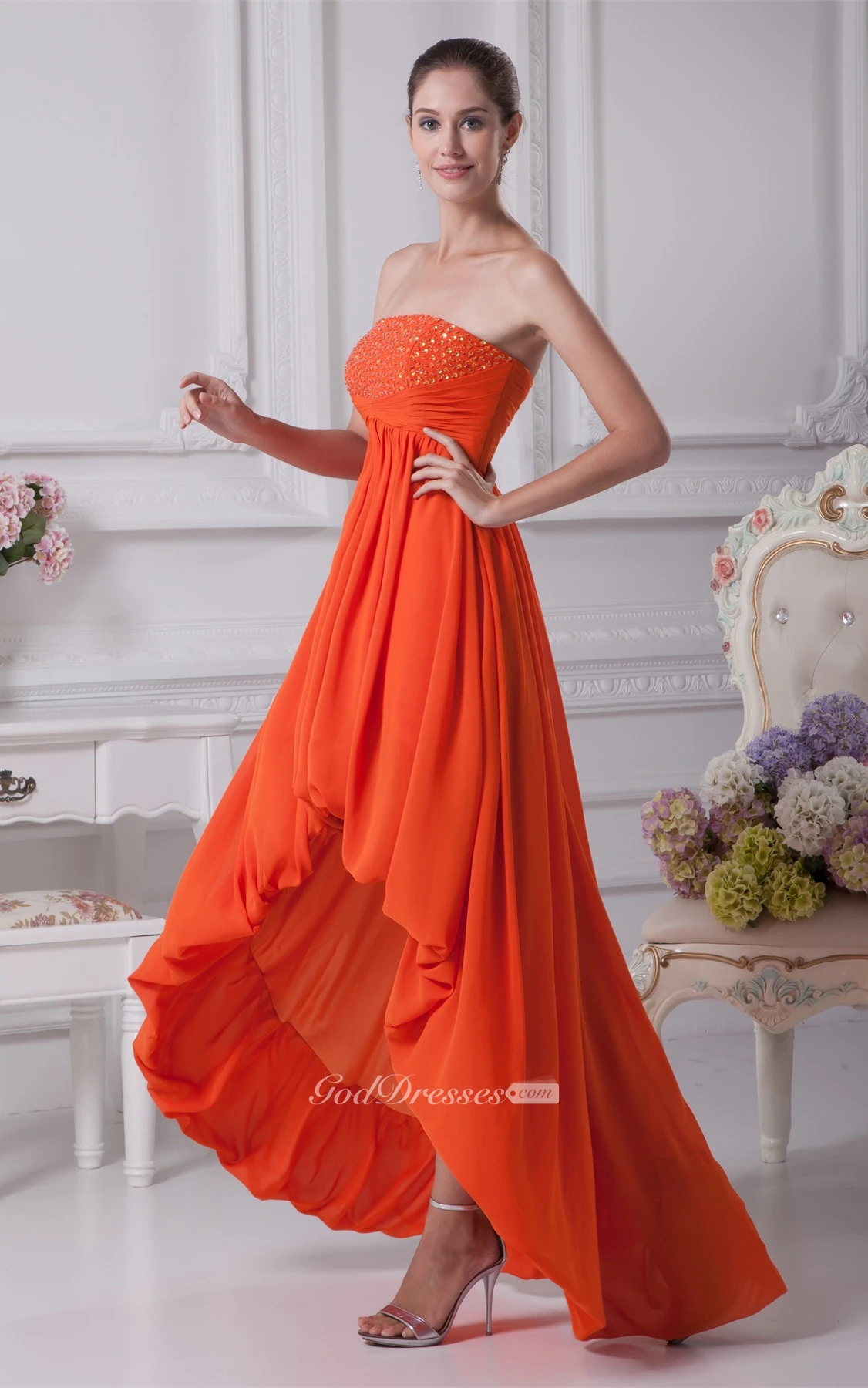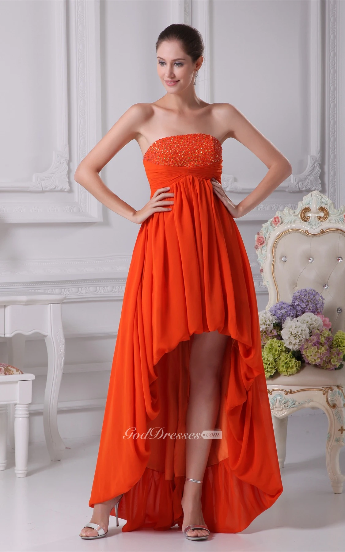 Sleeveless High-Low Chiffon Gemmed Dress With Pleats