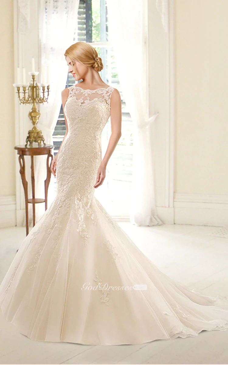 Sleeveless Illusion Neck Mermaid Lace Wedding Dress With V Back