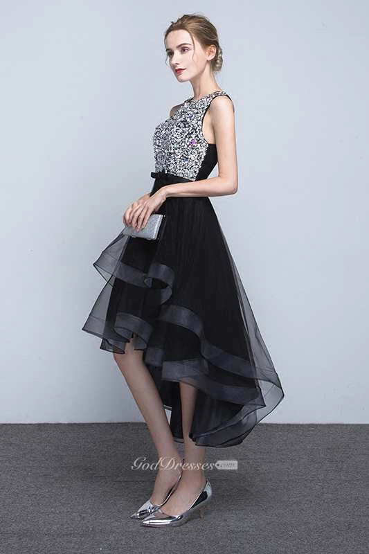 Sleeveless Jewel Neck High Low Organza Dress With Beaded Bodice
