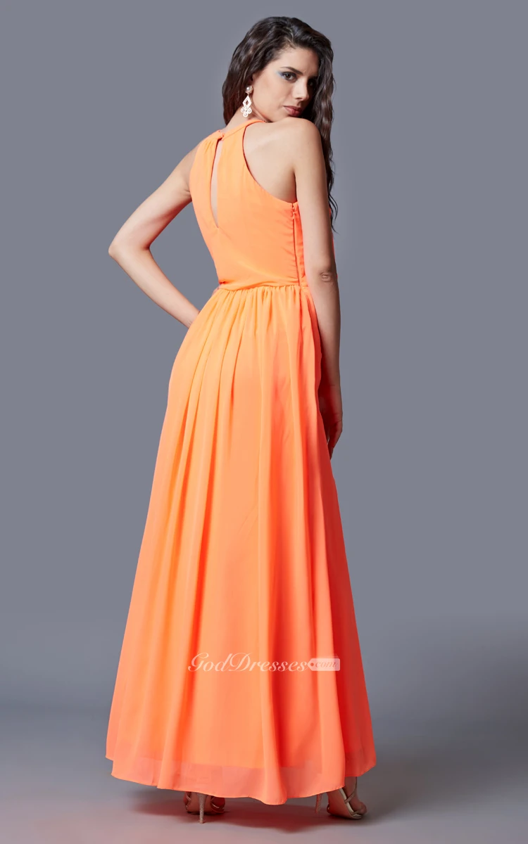 Sleeveless Jewel Neck Pleated Long Chiffon Dress With Cut-out