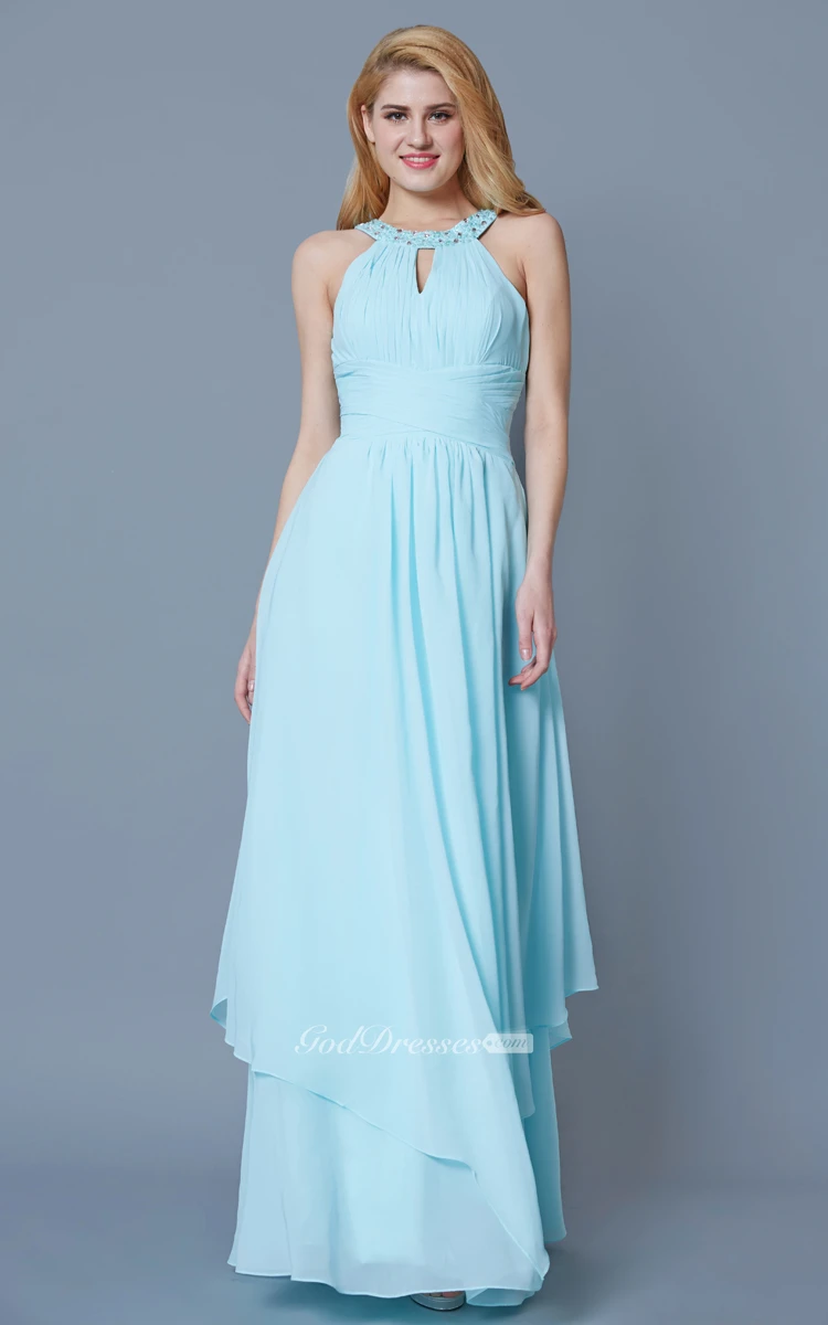 Sleeveless Jewel Neck Ruffled Long Chiffon Dress